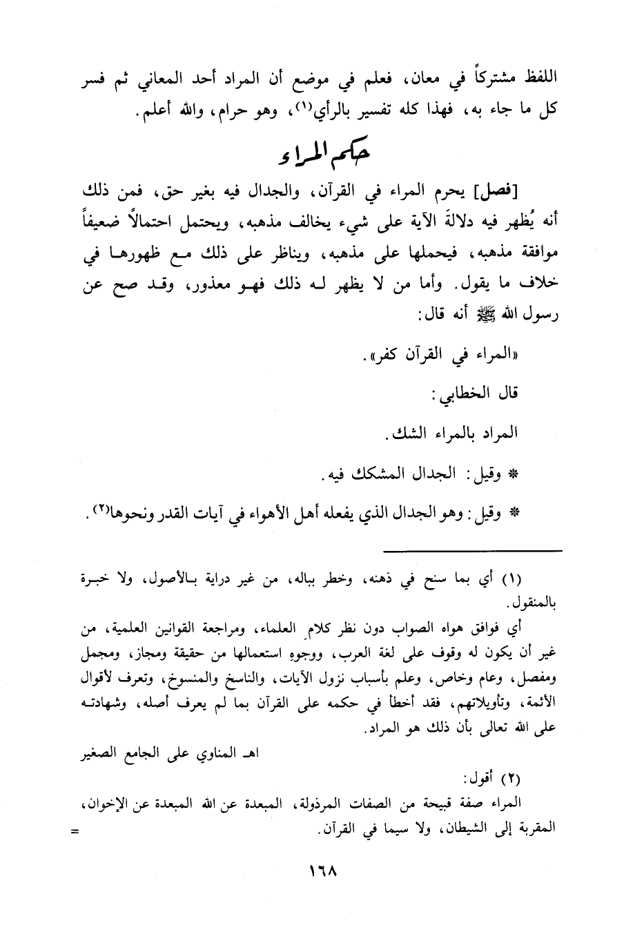 [فصل] يحرم المراء في القرآن والجدال فيه بغير حق فمن ذلك أن يظهر فيه دلالة الآية على شئ يخالف مذهبه ويحتمل احتمالا ضعيفا موافقة مذهبه فيحملها على مذهبه ويناظر على ذلك مع ظهورها في خلاف ما يقول وأما من لا يظهر له ذلك فهو معذور وقد صح عن رسول الله صلى الله عليه وسلم: أنه قال المراء في القرآن كفر قال الخطابي المراد بالمراء الشك * وقيل الجدال المشكك فيه * وقيل وهو الجدال الذي يفعله أهل الأهواء في آيات القدر ونحوها