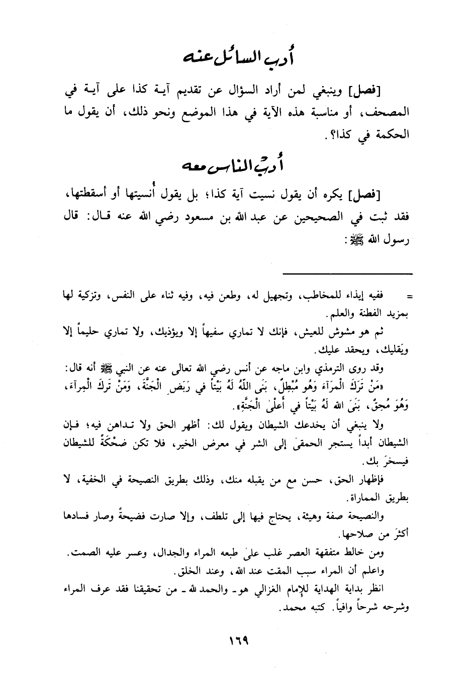 [فصل] وينبغي لمن أراد السؤال عن تقديم آية على آية في المصحف أو مناسبة هذه الآية في هذا الموضع ونحو ذلك أن يقول ما الحكمة في كذا