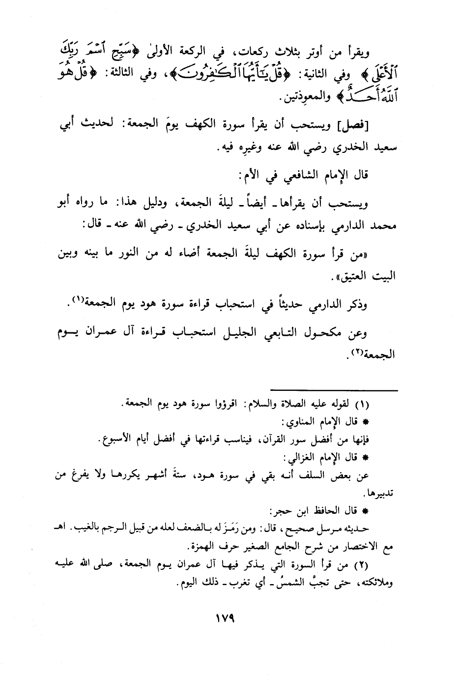 [فصل] ويستحب أن يقرأ سورة الكهف يوم الجمعة لحديث أبي سعيد الخدري رضي الله عنه وغيره فيه قال الامام الشافعي في الأم ويستحب أن يقرأها أيضا ليلة الجمعة ودليل هذا ما رواه أبو محمد الدارمي باسناده عن أبي سعيد الخدري رضي الله عنه قال من قرأ سورة الكهف ليلة الجمعة أضاء له النور فيما بينه وبين البيت العتيق وذكر الدارمي حديثا في استحباب قرأءة سورة هود يوم الجمعة وعن مكحول التابعي الجليل استحباب قراءة آل عمران يوم الجمعة