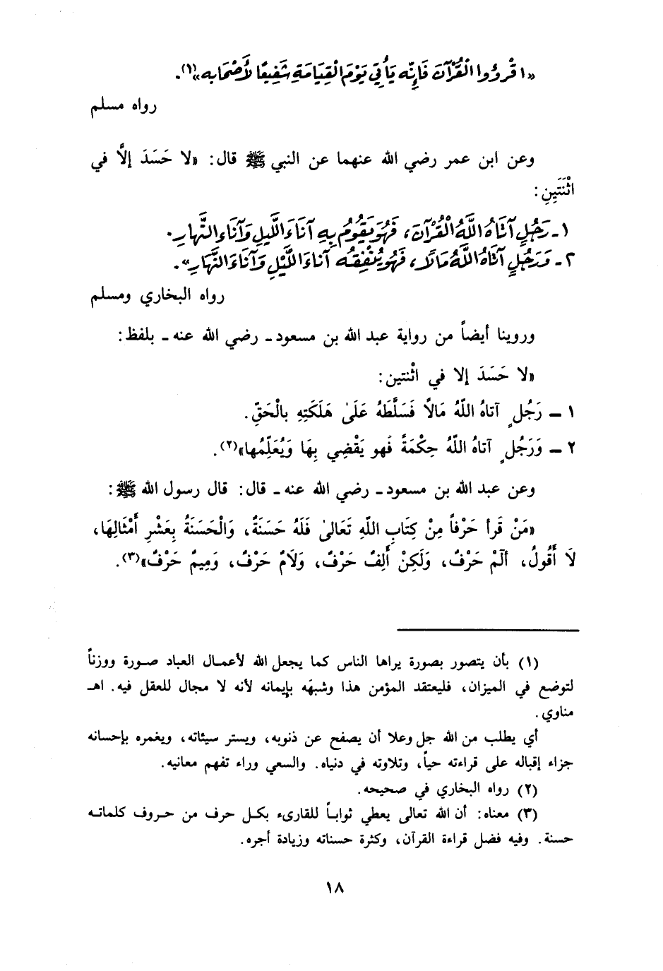 وعن ابن عمر رضي الله عنهما عن النبي صلى الله عليه وسلم: قال لا حسد إلا في اثنتين 1 - رجل آتاه الله القرآن فهو يقوم به آناء الليل وآناء النهار 2 - ورجل آتاه الله مالا فهو ينفقه آناء الليل وآناء النهار رواه البخاري ومسلم وروينا أيضا من رواية عبد الله بن مسعود رضي الله عنه بلفظ لا حسد إلا في اثنتين 1 - رجل آتاه الله مالا فسلطه على هلكته في الحق 2 - ورجل آتاه الله حكمة فهو يقضي بها ويعلمها وعن عبد الله بن مسعود رضي الله عنه قال قال رسول الله صلى الله عليه وسلم: من قرأ حرفا من كتاب الله تعالى فله حسنة والحسنة بعشر أمثالها لا أقول ألم حرف ولكن ألف حرف ولام حرف وميم حرف