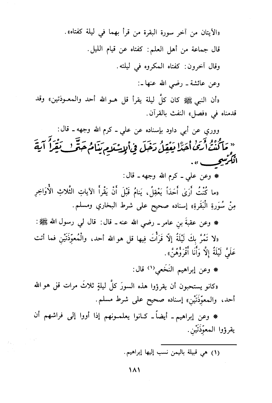 وعن عائشة رضي الله عنها أن النبي صلى الله علية وسلم: كان كل ليلة يقرأ قل هو الله أحد والمعوذتين وقد قدمناه في فصل النفث بالقرآن وروى عن أبي داود باسناده عن علي كرم الله وجهه قال ما كنت أرى أحدا يعقل دخل في الاسلام ينام حتى يقرأ آية الكرسي * وعن علي كرم الله وجهه أيضا قال ما كنت أرى أحدا يعقل ينام قبل أن يقرأ الآيات الثلاث الأواخر من سورة البقرة اسناده صحيح على شرط البخاري ومسلم * وعن عقبة بن عامر رضي الله عنه قال قال لي رسول الله صلى الله عليه وسلم: لا تمر بك ليلة إلا قرأت فيها قل هو الله أحد والمعوذتين فما أتت علي ليلة إلا وأنا أقرؤهن * فإن وعن إبراهيم النخعي قال كانوا يستحبون أن يقرؤوا هذه السور كل ليلة ثلاث مرات قل هو الله أحد والمعوذتين إسناده صحيح على شرط مسلم * وعن إبراهيم أيضا كانوا يعلمونهم إذا أووا إلى فراشهم أن يقرؤوا المعوذتين