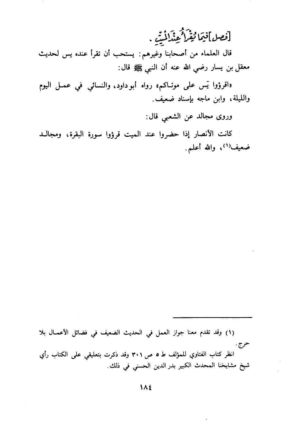 [فصل] فيما يقرأ عند الميت قال العلماء من أصحابنا وغيرهم يستحب أن تقرأ عنده يس لحديث معقل بن يسار رضي الله عنه أن النبي صلى الله عليه وسلم: قال اقرؤوا يس على موتاكم رواه أبو داود والنسائي في عمل اليوم والليلة وابن ماجه باسناد ضعيف وروى مجالد عن الشعبي قال كانت الأنصار إذا حضروا عند الميت قرؤوا سورة البقرة ومجالد ضعيف والله أعلم