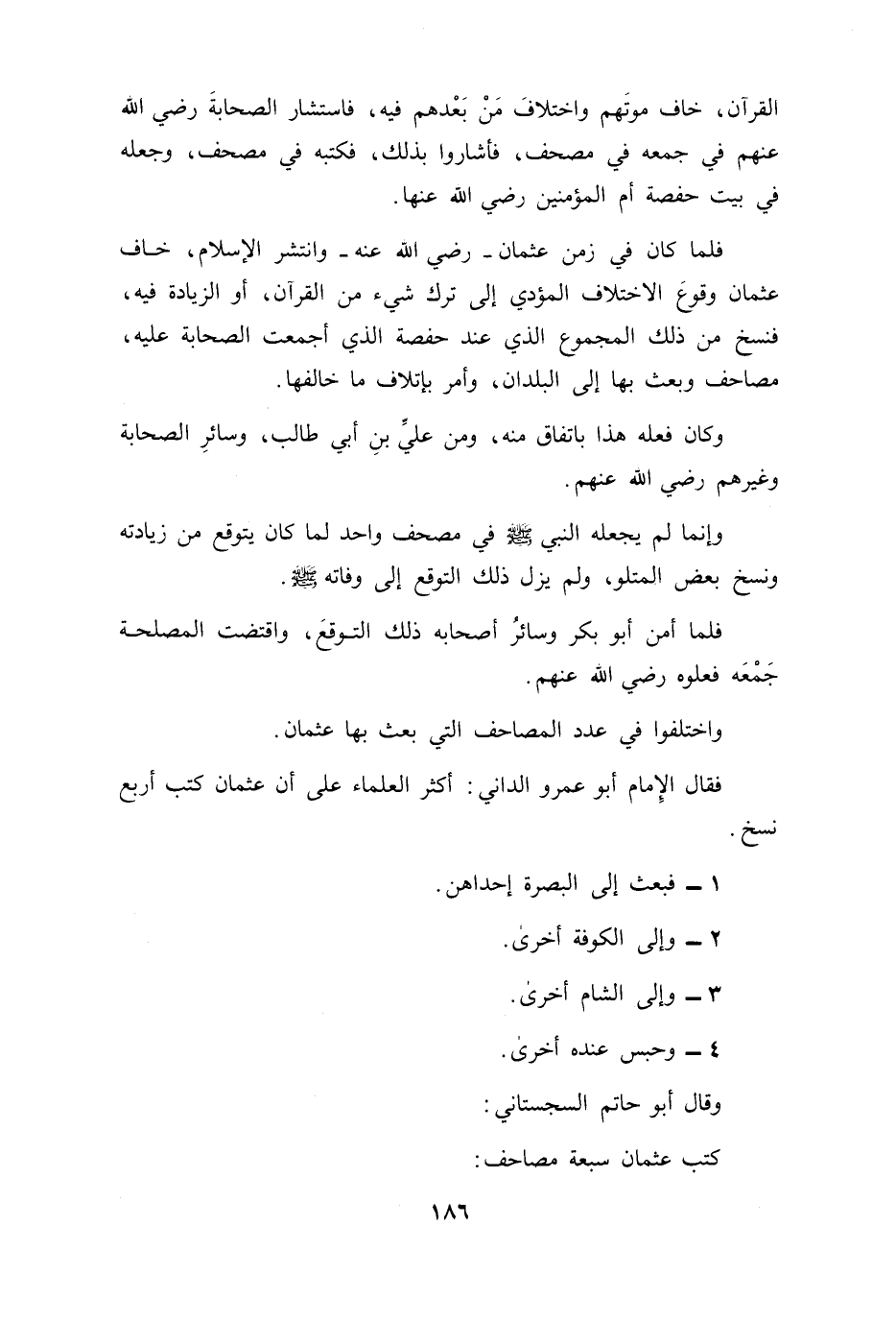 القرآن خاف موتهم واختلاف من بعدهم فيه فاستشار الصحابة رضي الله عنهم في جمعه في مصحف فأشاروا بذلك فكتبه في مصحف وجعله في بيت حفصة أم المؤمنين رضي الله عنها فلما كان في زمن عثمان رضي الله عنه وانتشر الاسلام خاف عثمان وقوع الاختلاف المؤدي إلى ترك شئ من القرآن أو الزيادة فيه فنسخ من ذلك المجموع الذي عند حفصة الذي أجمعت الصحابة علية مصاحف وبعث بها إلى البلدان وأمر باتلاف ما خالفها وكان فعله هذا باتفاق منه ومن على بن أبي طالب وسائر الصحابة وغيرهم رضي الله عنهم وإنما لم يجعله النبي صلى الله عليه وسلم: في مصحف واحد لما كان يتوقع من زيادته ونسخ بعض المتلو ولم يزل ذلك التوقع الى وفاته صلى الله عليه وسلم: فلما أمن أبو بكر وسائر أصحابه ذلك التوقع واقتضت المصلحة جمعه فعلوه رضي الله عنهم واختلفوا في عدد المصاحف التي بعث بها عثمان فقال الامام أبو عمرو الداني أكثر العلماء على أن عثمان كتب أربع نسخ 1 - فبعث إلى البصرة إحداهن 2 - وإلى الكوفة أخرى 3 - والى الشام أخرى 4 - وحبس عنده أخرى وقال أبو حاتم السجستاني كتب عثمان سبعة مصاحف