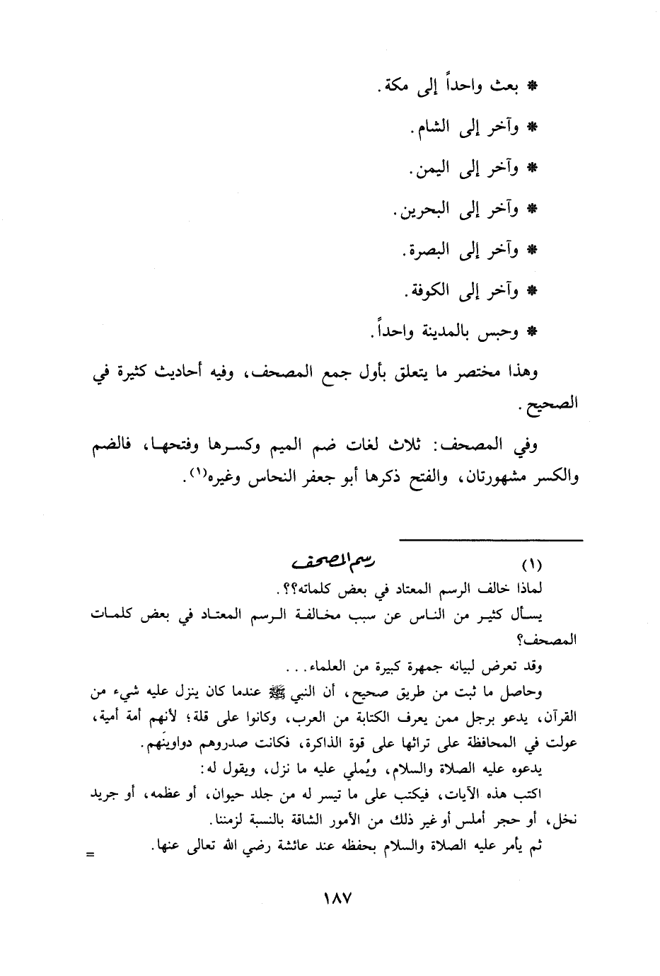 * بعث واحدا إلى مكة * وآخر إلى الشام * وآخر إلى اليمن * وآخر إلى البحرين * وآخر إلى البصرة * وآخر إلى الكوفة * وحبس بالمدينة واحدا وهذا مختصر ما يتعلق بأول جمع المصحف وفيه أحاديث كثيرة في الصحيح وفي المصحف ثلاث لغات ضم الميم وكسرها وفتحها فالضم والكسر مشهورتان والفتح ذكرها أبو جعفر النحاس وغيره