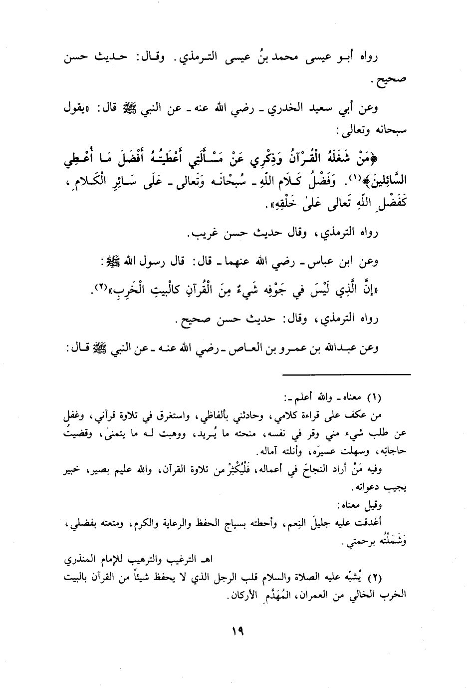 رواه أبو عيسى محمد بن عيسى الترمذي وقال حديث حسن صحيح وعن أبي سعيد الخدري رضي الله عنه عن النبي صلى الله عليه وسلم: قال يقول سبحانه وتعالى (من شغله القرآن وذكري عن مسألتي أعطيته أفضل ما أعطي السائلين وفضل كلام الله سبحانه وتعالى عن سائر الكلام كفضل الله تعالى على خلقه رواه الترمذي وقال حديث حسن غريب.