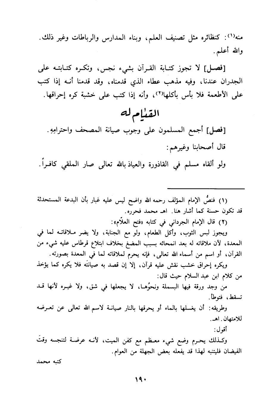 [فصل] أجمع المسلمون على وجوب صيانة المصحف واحترامه قال أصحابنا وغيرهم ولو ألقاه مسلم في القاذورة والعياذ بالله تعالى صار الملقي كافرا