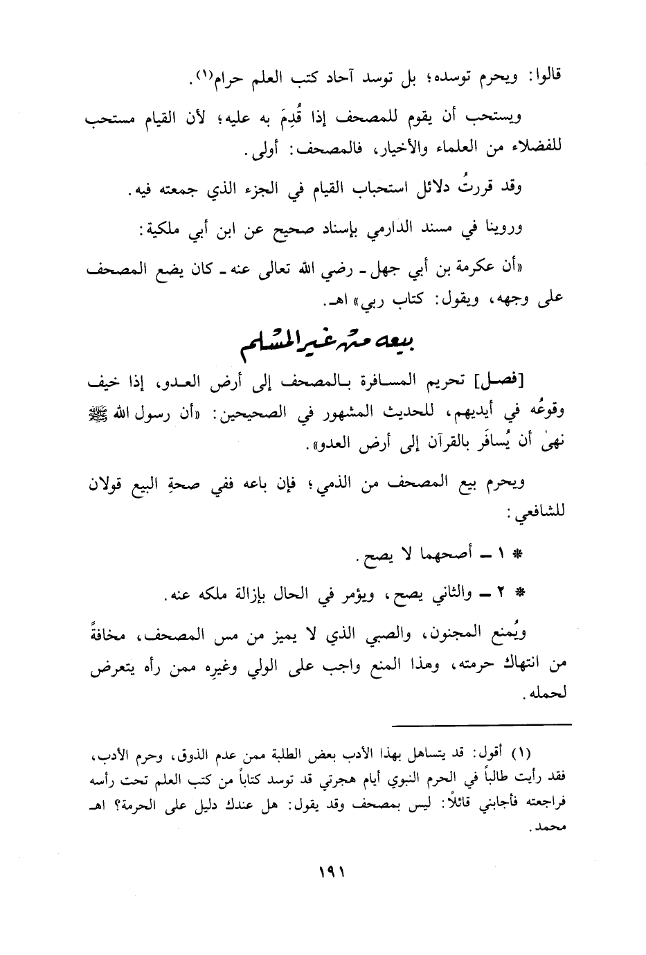 قالوا ويحرم توسده بل توسد آحاد كتب العلم حرام ويستحب أن يقوم للمصحف إذا قدم به عليه لأن القيام مستحب للفضلاء من العلماء والأخيار فالمصحف أولى وقد قررت دلائل استحباب القيام في الجزء الذي جمعته فيه وروينا في مسند الدارمي باسناد صحيح عن ابن أبي مليكة أن عكرمة بن أبي جهل رضي الله عنه كان يضع المصحف على وجهه ويقول كتاب ربي اه.