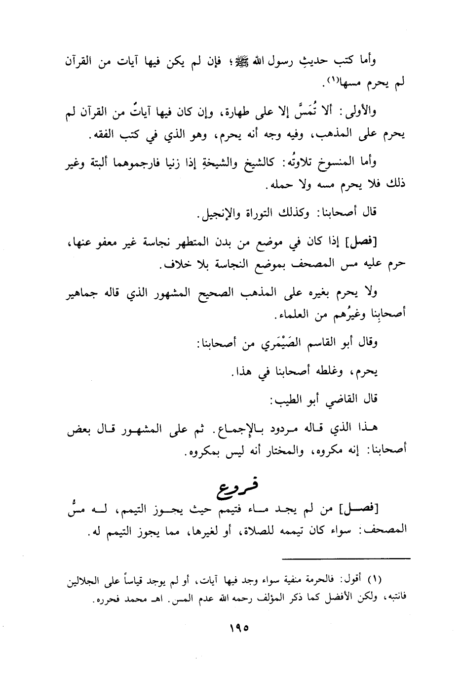 [فصل] إذا كان في موضع من بدن المتطهر نجاسة غير معفو عنها حرم عليه مس المصحف بموضع النجاسة بلا خلاف ولا يحرم بغيره على المذهب الصحيح المشهور الذي قاله جماهير أصحابنا وغيرهم من العلماء وقال أبو القاسم الصيمري من أصحابنا يحرم وغلطه أصحابنا في هذا قال القاضي أبو الطيب هذا الذي قاله مردود بالاجماع ثم على المشهور قال بعض أصحابنا انه مكروه والمختار أنه ليس بمكروه