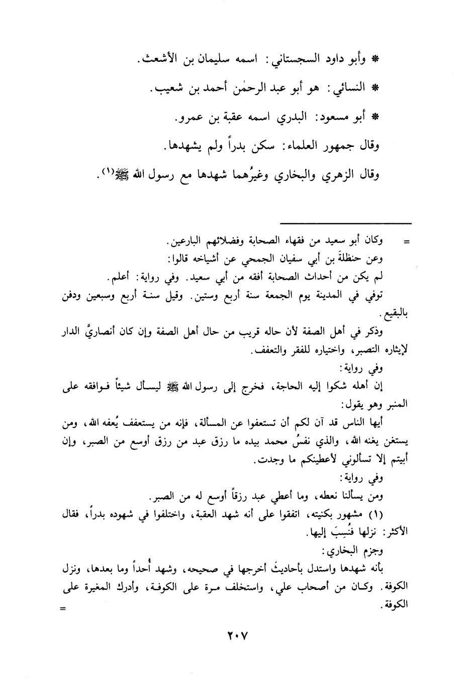 * أبو مسعود البدري أسمه عقبة بن عمرو وقال جمهور العلماء سكن بدراً ولم يشهدها وقال الزهري والبخاري وغيرهما شهدها مع رسول الله صلى الله عليه وسلم