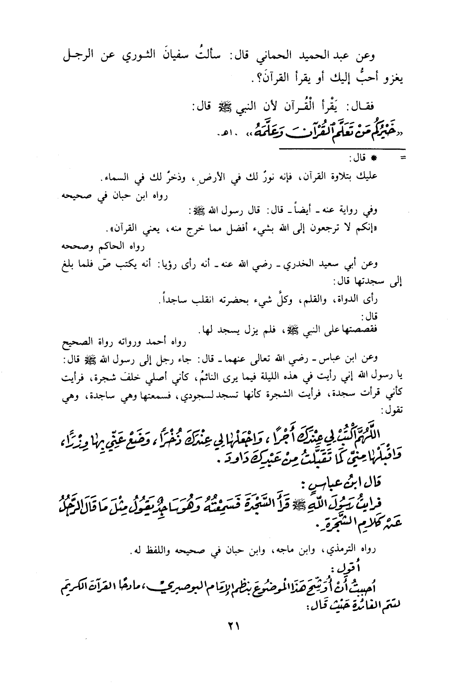 وعن الحميدي الجمالي قال سألت سفيان الثوري عن الرجل يغزو أحب إليك أو يقرأ القرآن فقال يقرأ القرآن لأن النبي صلى الله عليه وسلم: قال خيركم من تعلم القرآن وعلمه