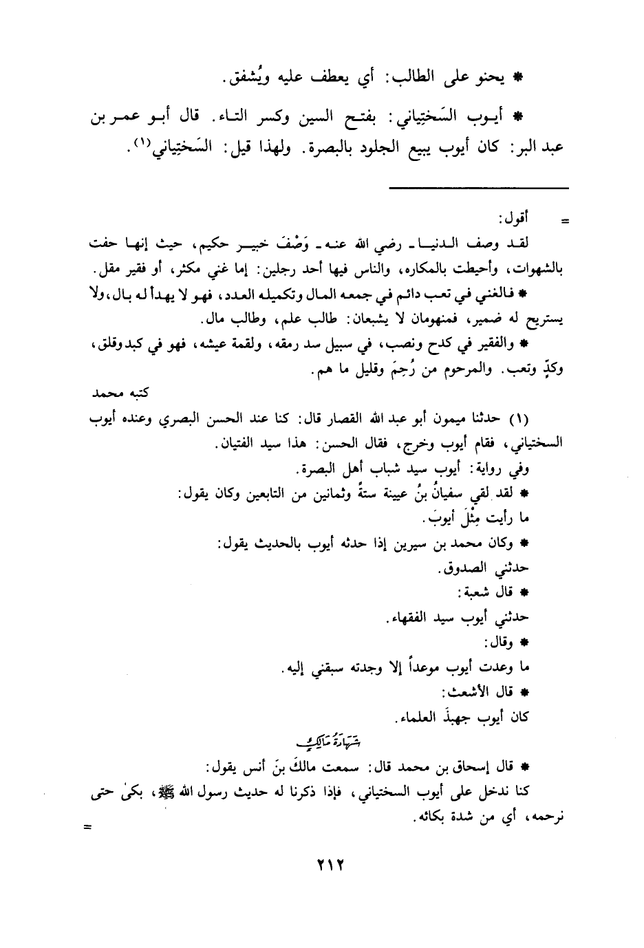 * أيوب السختياني بفتح السين وكسر التاء قال أبو عمر بن عبد البر كان أيوب يبيع الجلود بالبصرة ولهذا قيل السختياني