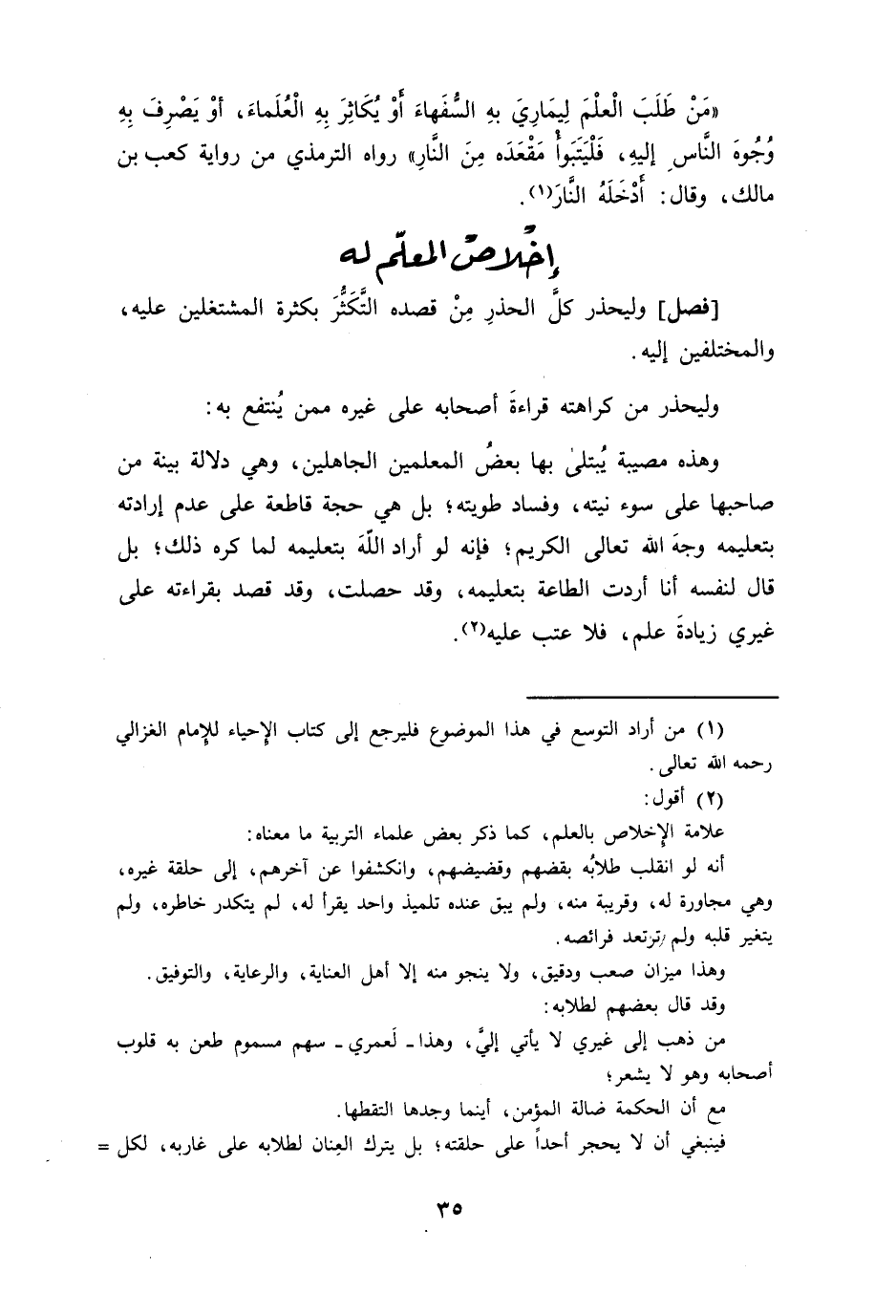 [فصل] وليحذر كل الحذر من قصده التكثر بكثرة المشتغلين عليه والمختلفين إليه وليحذر من كراهته قراءة أصحابه على غيره ممن ينتفع به وهذه مصيبة يبتلى بها بعض المعلمين الجاهلين وهي دلالة بينة من صاحبها على سوء نيته وفساد طويته بل هي حجة فاطعة على عدم إرادته بتعليمه وجه الله تعالى الكريم فإنه لو أراد الله بتعليمه لما كره ذلك بل قال لنفسه أنا أردت الطاعة بتعليمه وقد حصلت وقد قصد بقراءته على غيري زيادة علم فلا عتب عليه
