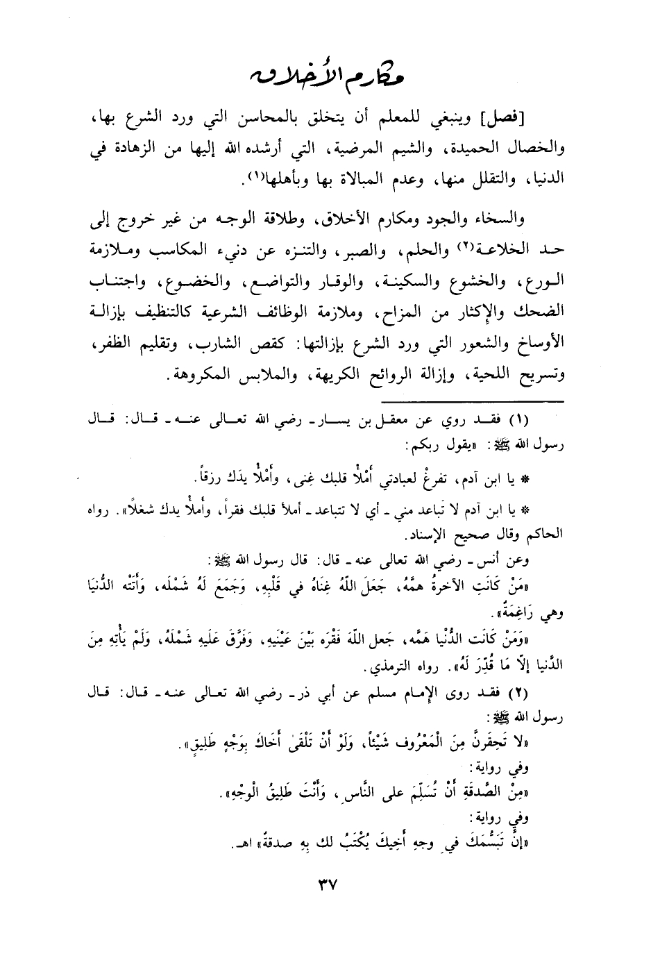 [فصل] وينبغي للمعلم أن يتخلق بالمحاسن التي ورد الشرع بها والخصال الحميدة والشيم المرضية التي أرشده الله إليها من الزهادة في الدنيا والتقلل منها وعدم المبالاة بها وبأهلها والسخاء والجود ومكارم الأخلاق وطلاقة الوجه من غير خروج إلى حد الخلاعة والحلم والصبر والتنزه عن دنئ المكاسب وملازمة الورع والخشوع والسكينة والوقار والتواضع والخضوع واجتناب الضحك والإكثار من المزاح وملازمة الوظائف الشرعية كالتنظيف وتقليم بإزالة الأوساخ والشعور التي ورد الشرع بإزالتها كقص الشارب وتقليم الظفر وتسريح اللحية وإزالة الروائح الكريهة والملابس المكروهة
