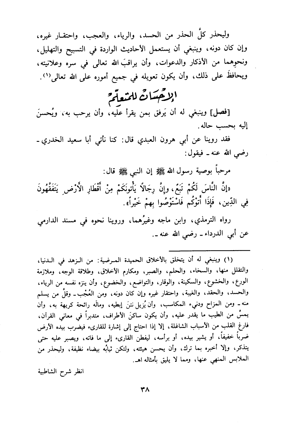 [فصل] وينبغي له أن يرفق بمن يقرأ عليه وأن يرحب به ويحسن إليه بحسب حاله فقد روينا عن أبي هرون العبدي قال كنا نأتي أبا سعيد الخدري رضي الله عنه فيقول: مرحبا بوصية رسول الله صلى الله عليه وسلم: إن النبي صلى الله عليه وسلم: قال إن الناس لكم تبع وإن رجالا يأتونكم من أقطار الأرض يتفقهون في الدين فإذا أتوكم فاستوصوا بهم خيرا رواه الترمذي وابن ماجه وغيرهما وروينا نحوه في مسند الدارمي عن أبي الدرداء رضي الله عنه