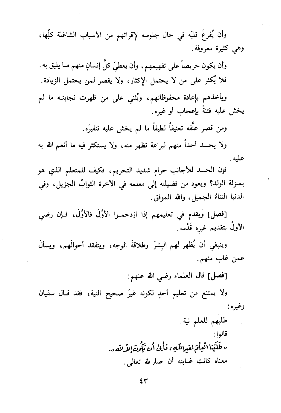 [فصل] قال العلماء رضي الله عنهم ولا يمتنع من تعليم أحد لكونه غير صحيح النية فقد قال سفيان وغيره طلبهم للعلم نية وقالوا طلبنا العلم لغير الله فأبى أن يكون إلا لله معناه كانت غايته أن صار لله تعالى