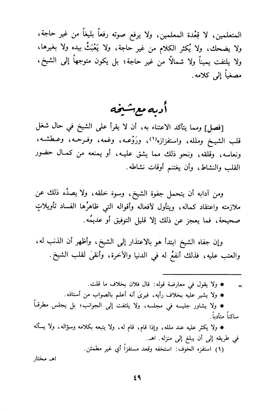 المعلمين ولا يرفع صوته رفعا بليغا من غير حاجة ولا يضحك ولا يكثر الكلام من غير حاجة ولا يعبث بيده ولا بغيرها ولا يلتفت يمينا ولا شمالا من غير حاجة بل يكون متوجها إلى الشيخ مصغيا إلى كلامه أدبه مع شيخه