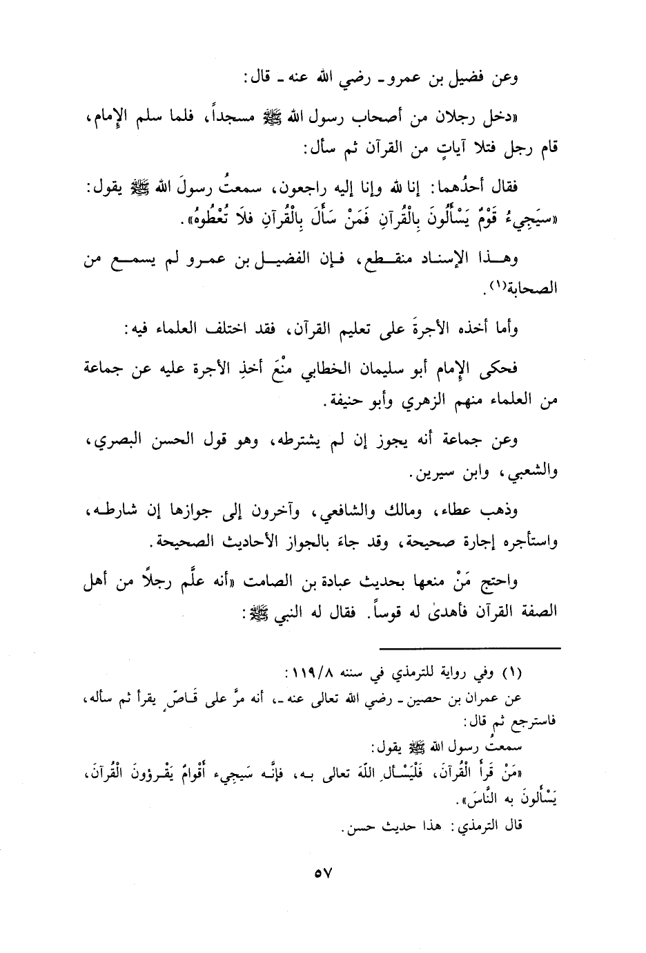 وعن فضيل بن عمرو رضي الله عنه قال دخل رجلان من أصحاب رسول الله صلى الله عليه وسلم: مسجدا فلما سلم الإمام قام رجل فتلا آيات من القرآن ثم سأل فقال أحدهما إنا لله وإنا إليه راجعون سمعت رسول الله صلى الله عليه وسلم: يقول سيجئ قوم يسألون بالقرآن فمن سأل بالقرآن فلا تعطوه وهذا الإسناد منقطع فإن الفضل بن عمرو لم يسمع الصحابة وأما أخذ الأجرة على تعليم القرآن فقد اختلف العلماء فيه فحكى الإمام أبو سليمان الخطابي منع أخذ الأجرة عليه من جماعة من العلماء منهم الزهري وأبو حنيفة وعن جماعة أنه يجوز إن لم يشترطه وهو قول الحسن البصري والشعبي وابن سيرين وذهب عطاء ومالك والشافعي وآخرون إلى جوازها إن شارطه واستأجره إجارة صحيحة وقد جاء بالجواز الأحاديث الصحيحة واحتج من منعها بحديث عبادة بن الصامت أنه علم رجلا من أهل الصفة القرآن فأهدى له قوسا فقال له النبي صلى الله عليه وسلم: