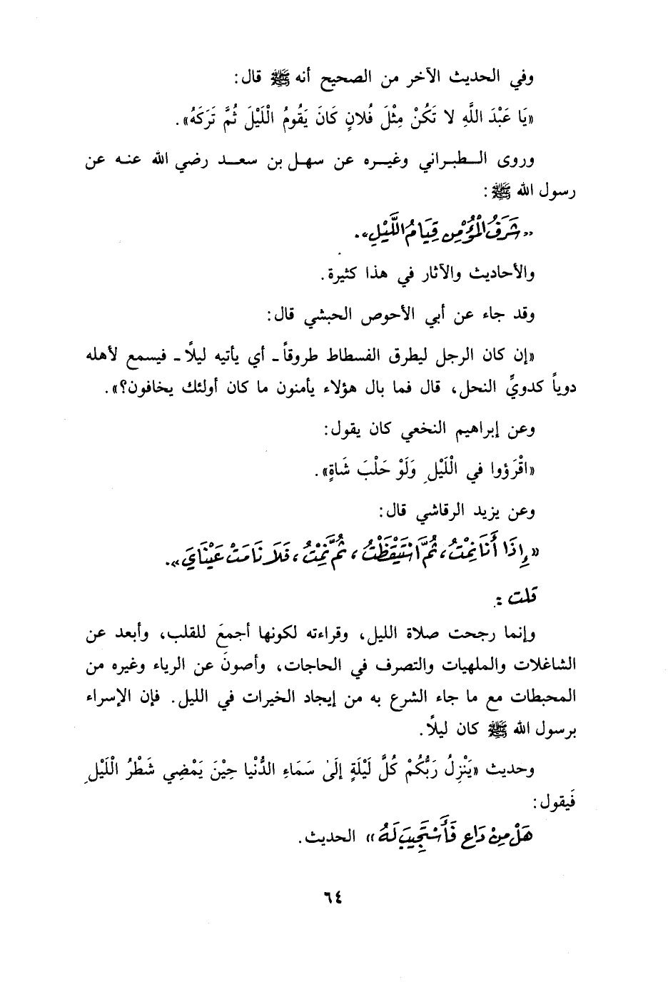 وفي الحديث الآخر من الصحيح أنه صلى الله عليه وسلم: قال يا عبد الله لا تكن مثل فلان كان يقوم الليل ثم تركه وروى الطبراني وغيره عن سهل بن سعد رضي الله عنه عن رسول الله صلى الله عليه وسلم: قال شرف المؤمن قيام الليل والأحاديث والآثار في هذا كثيرة وقد جاء عن أبي الأحوص الحبشي قال إن كان الرجل ليطرق الفسطاط طروقا أي يأتيه ليلا فيسمع لأهله دويا كدوي النحل قال فما بال هؤلاء يأمنون ما كان أولئك يخافون وعن إبراهيم النخعي كان يقول اقرؤوا من الليل ولو حلب شاة