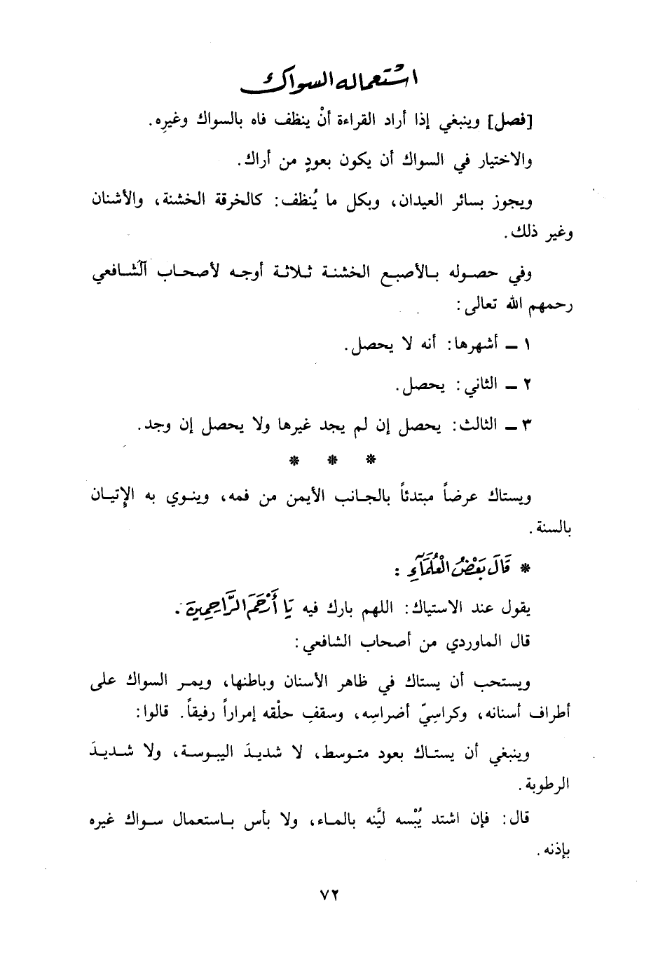 قال بعض العلماء يقول عند الإستياك اللهم بارك لي فيه يا أرحم الراحمين قال الماوردي من أصحاب الشافعي ويستحب أن يستاك في ظاهر الأسنان وباطنها ويمر السواك على أطراف أسنانه وكراسي أضراسه وسقف حلقه إمرارا رفيقا قالوا وينبغي أن يستاك بعود متوسط لا شديد اليبوسة ولا شديد الرطوبة قال فإن اشتد يبسه لينه بالماء ولا بأس باستعمال سواك غيره بإذنه