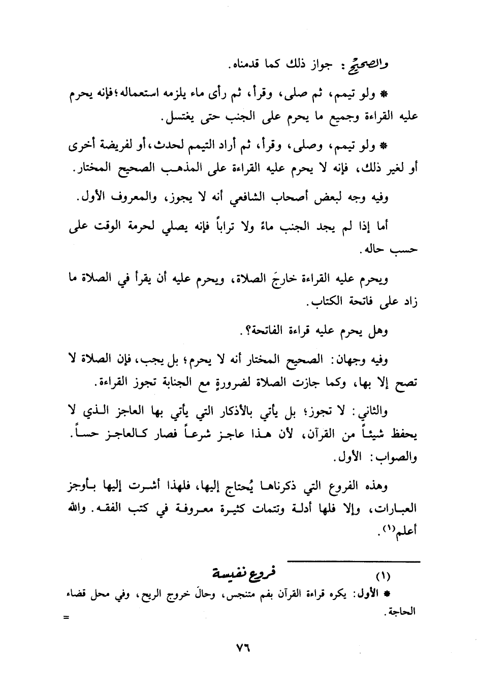 والصحيح جواز ذلك كما قدمناه * ولو يتمم ثم صلى وقرأ ثم رأى ماء يلزمه استعماله فإنه يحرم عليه القراءة وجميع ما يحرم على الجنب حتى يغتسل * ولو تيمم وصلى وقرأ ثم أراد التيمم لحدث أو لفريضة أخرى أو لغير ذلك فإنه لا يحرم عليه القراءة على المذهب الصحيح المختار وفيه وجه لبعض أصحاب الشافعي أنه لا يجوز والمعروف الأول أما إذا لم يجد الجنب ماء ولا ترابا فإنه لا يصلي لحرمة الوقت على حسب حاله ويحرم عليه القراءة خارج الصلاة ويحرم عليه أن يقرأ في الصلاة ما زاد على فاتحة الكتاب وهل يحرم عليه قراءة الفاتحة فيه وجهان الصحيح المختار أنه لا يحرم بل يجب فإن الصلاة لا تصح إلا بها وكلما جازت الصلاة لضرورة مع الجنابة يجوز القراءة والثاني لا يجوز بل يأتي بالأذكار التي يأتي بها العاجز الذي لا يحفظ شيئا من القرآن لأن هذا عاجز شرعا فصار كالعاجز حسا والصواب الأول وهذه الفروع التي ذكرناها يحتاج إليها فلهذا أشرت إليها بأوجز العبارات وإلا فلها أدلة وتتمات كثيرة معروفة في كتب الفقه والله أعلم