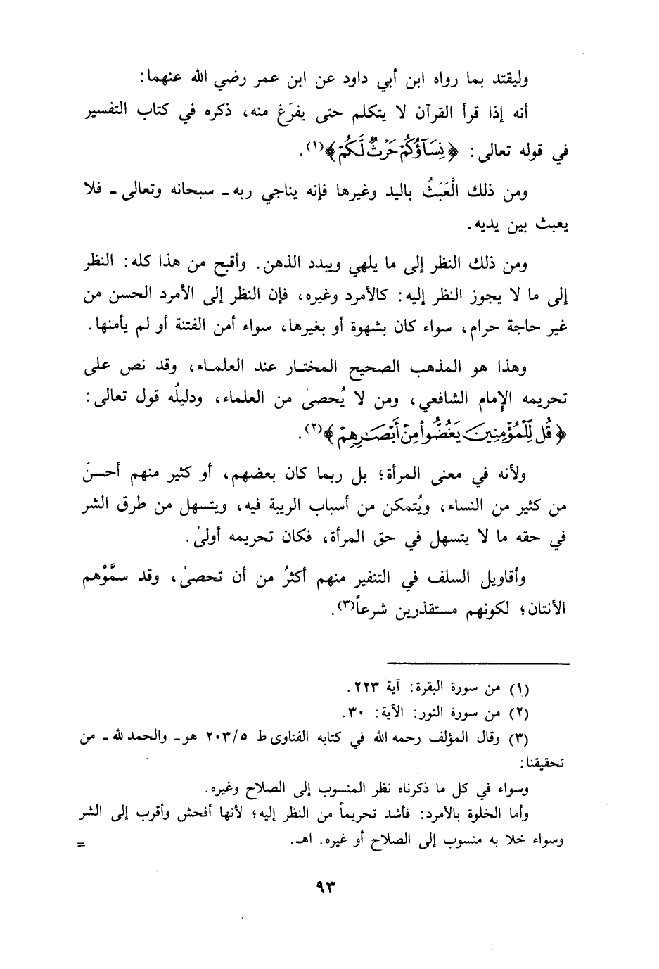 وليقتد بما رواه ابن أبي داود عن ابن عمر رضي الله عنهما أنه كان إذا قرأ القرآن لا يتكلم حتى يفرغ منه ذكره في كتاب التفسير في قوله تعالى نساؤكم حرث لكم) ومن ذلك العبث باليد وغيرها فإنه يناجي ربه سبحانه وتعالى فلا يعبث بين يديه ومن ذلك النظر إلى ما يلهي ويبدد الذهن وأقبح من هذا كله النظر إلى ما لا يجوز النظر إليه كالأمرد وغيره فإن النظر إلى الأمرد الحسن من غير حاجة حرام سواء كان بشهوة أو بغيرها سواء أمن الفتنة أو لم يأمنها هذا هو المذهب الصحيح المختار عند العلماء وقد نص على تحريمه الإما الشافعي ومن لا يحصى من العلماء ودليله قوله تعالى (قل للمؤمنين يغضوا من أبصارهم) ولأنه في معنى المرأة بل ربما كان بعضهم أو كثير منهم أحسن من كثير من النساء ويتمكن من أسباب الريبة فيه ويتسهل من طرق الشر في حقه ما لا يتسهل في حق المرأة فكان تحريمه أولى وأقاويل السلف في التنفير منهم أكثر من أن تحصى وقد سموهم الأنتان لكونهم مستقذرين شرعا