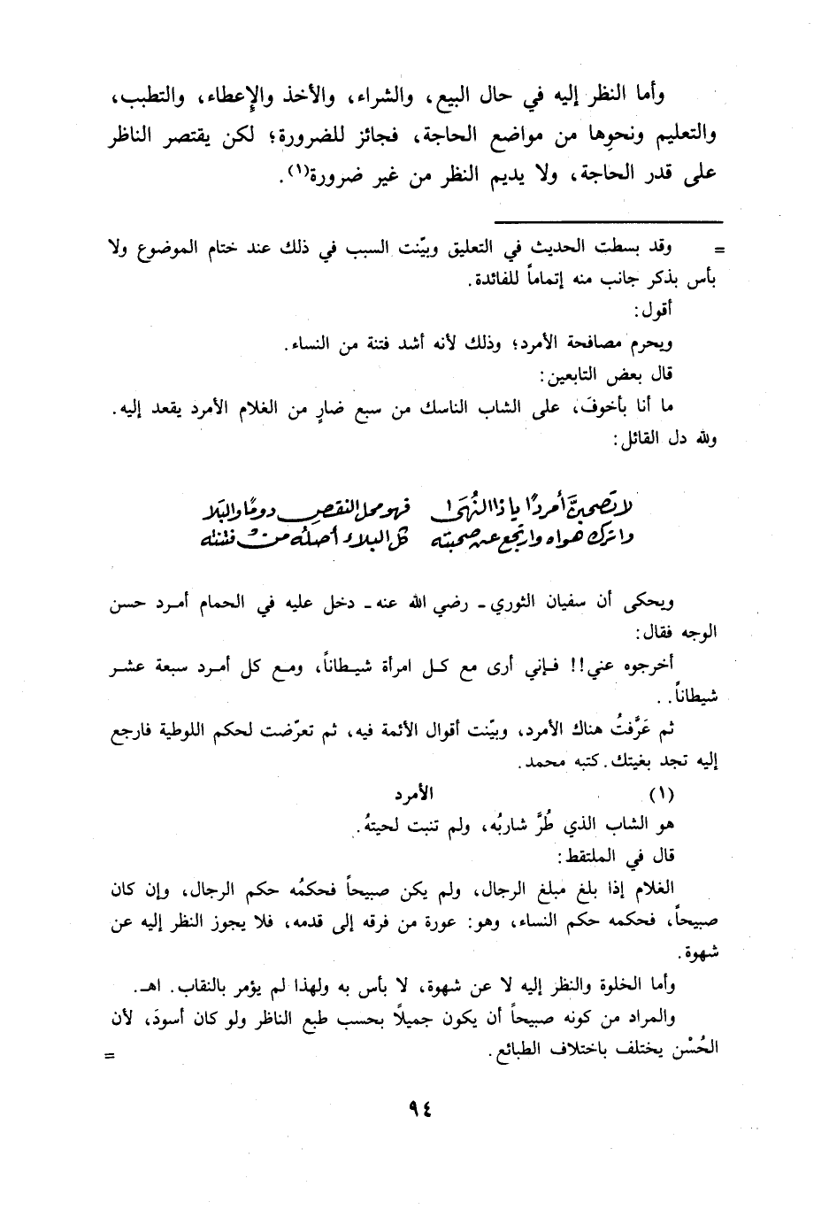 وأما النظر إليه في حال البيع والشراء والأخذ والإعطاء والتطبب والتعليم ونحوها من مواضع الحاجة فجائز للضرورة لكن يقتصر الناظر على قدر الحاجة ولا يديم النظر من غير ضرورة