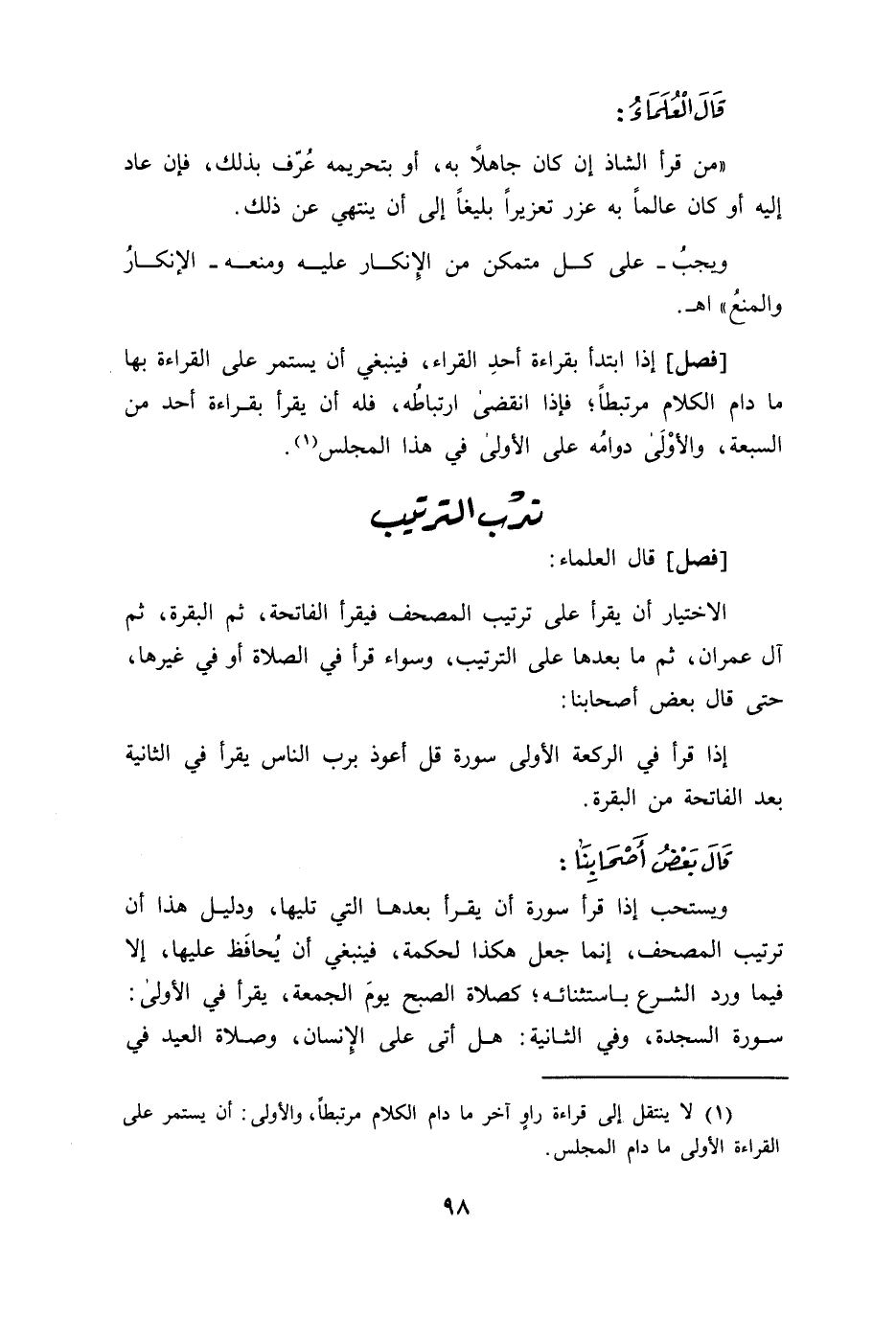 [فصل] قال العلماء الاختيار أن يقرأ على ترتيب المصحف فيقرأ الفاتحة ثم البقرة ثم آل عمران ثم ما بعدها على الترتيب وسواء قرأ في الصلاة أو في غيرها حتى قال بعض أصحابنا إذا قرأ في الركعة الأولى سورة قل أعوذ برب الناس يقرأ في الثانية بعد الفاتحة من البقرة قال بعض أصحابنا ويستحب إذا قرأ سورة أن يقرأ بعدها التي تليها ودليل هذا أن ترتيب المصحف إنما جعل هكذا لحكمة فينبغي أن يحافظ عليها إلا فيما ورد المشرع باستثنائه كصلاة الصبح يوم الجمعة يقرأ في الأولى سورة السجدة وفي الثانية هل أتى على الانسان وصلاة العيد في