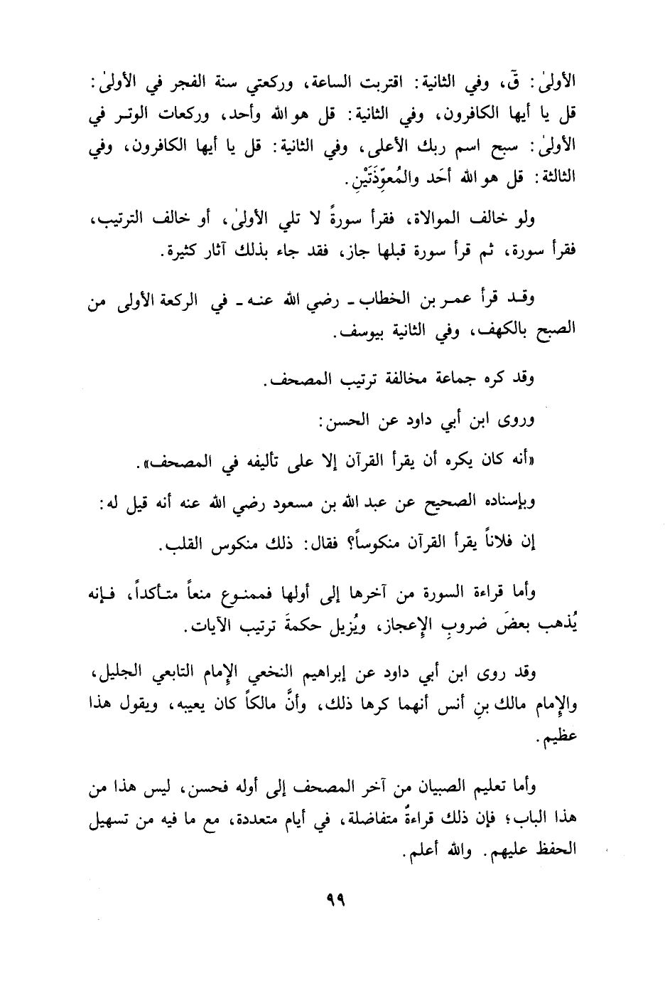 الأولى قاف وفي الثانية اقتربت الساعة وركعتين سنة الفجر في الأولى قل يا أيها الكافرون وفي الثانية قل هو الله أحد وركعات الوتر في الأولى سبح اسم ربك الأعلى وفي الثانية قل يا أيها الكافرون وفي الثالثة قل هو الله احد والمعوذتين ولو خالف الموالاة فقرأ سورة لا تلي الأولى أو خالف الترتيب فقرأ سورة ثم قرأ سورة قبلها جاز فقد جاء بذلك آثار كثيرة وقد قرأ عمر بن الخطاب رضي الله عنه في الركعة الأولى من الصبح بالكهف وفي الثانية بيوسف وقد كره جماعة مخالفة ترتيب المصحف وروى ابن أبي داود عن الحسن أنه كان يكره أن يقرأ القرآن إلا على تأليفه في المصحف وباسناده الصحيح عن عبد الله بن مسعود رضي الله عنه أنه قيل له إن فلانا يقرأ القرآن منكوسا فقال ذلك منكوس القلب وأما قراءة السور من آخرها إلى أولها فممنوع منعا متأكدا فإنه يذهب بعض ضروب الاعجاز ويزيل حكمة ترتيب الآيات وقد روى ابن أبي داود عن إبراهيم النخعي الإمام التابعي الجليل والإمام مالك بن أنس أنهما كرها ذلك وان مالكا كان يعيبه ويقول هذا عظيم وأما تعليم الصبيان من آخر المصحف إلى أوله فحسن ليس هذا من هذا الباب فإن ذلك قراءة متفاضلة في أيام متعددة مع ما فيه من تسهيل الحفظ عليهم والله أعلم