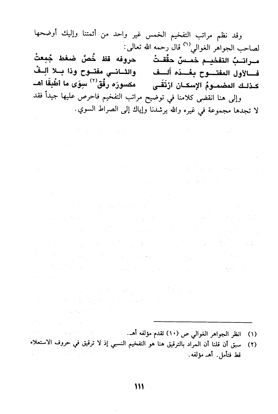 وقد نظم مراتب التفخيم الخمس غير واحد من أئمتنا وإليك أوضحها لصاحب الجواهر الغوالي قال رحمه الله تعالى: