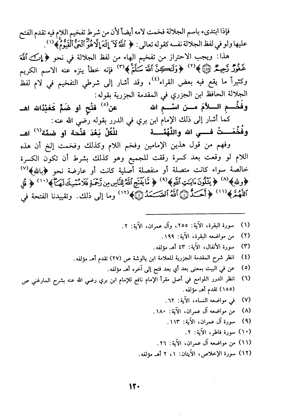 هذا: ويجب الاحتراز من تفخيم الهاء من لفظ الجلالة في نحو {إِنَّ الله غَفُورٌ رَّحِيمٌ} [البقرة: 199] {ولكن الله سَلَّمَ} [الأنفال: 43] فإنه خطأ ينزه عنه الاسم الكريم وكثيراً ما يقع فيه بعض القراء، وقد أشار إلى شرطي التفخيم في لام لفظ الجلالة الحافظ ابن لجزري في المقدمة الجزرية بقوله: