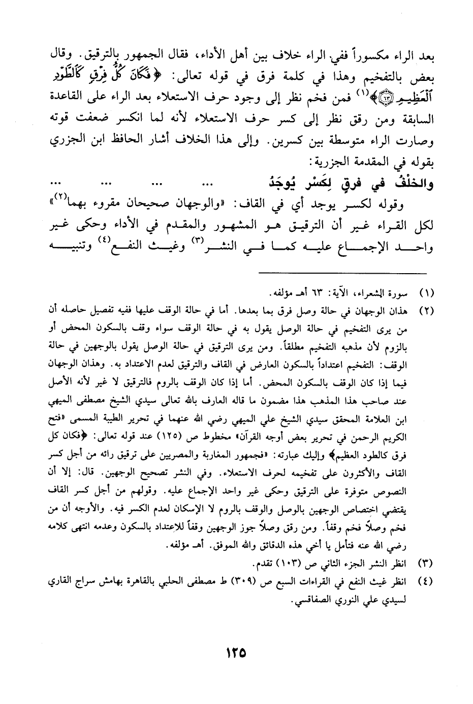 الغافلين وغيرها. قال صاحب انشراح الصدور: قال الداني: والوجهان جيدان والمأخوذ به الترقيق نقله النويري في شرح الطيبة فهو أولى بالعمل إفراداً وبالتقديم جمعاً أهـ بحروفه.