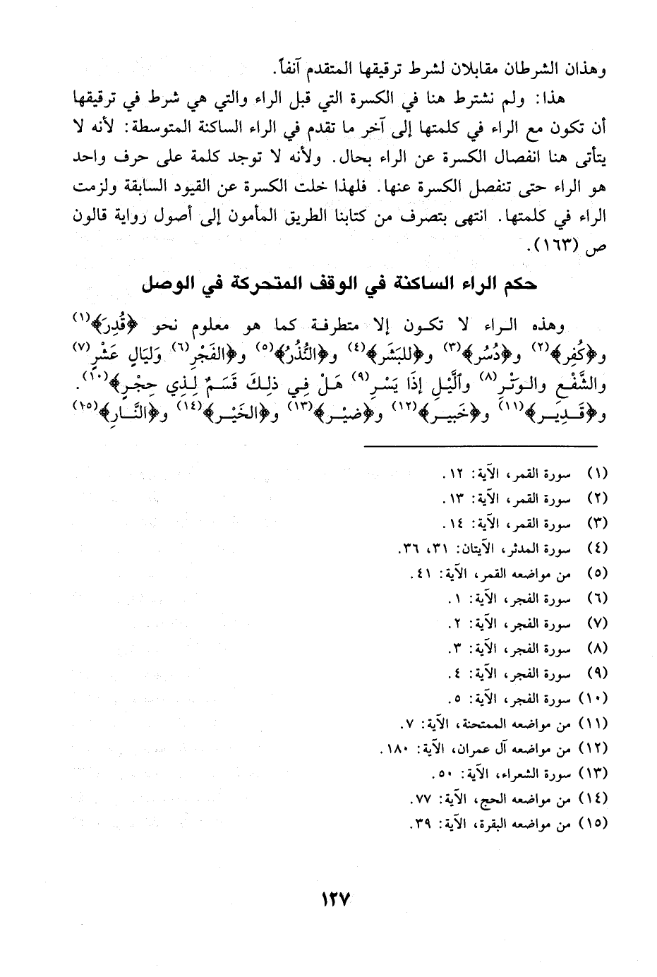 الأول: أن تسبق الراء كسرة نحو {قُدِرَ} [القمر: 12] و {كُفِرَ} [القمر: 14] و {الأشر} [القمر: 26] . وإذا تخلل بين الكسرة والراء ساكن بشرط ألا يكون حرف استعلاء فلا يضر وجوده في هذه الحالة ولا يزال الترقيق سارياً وذلك نحو {لِلذِّكْرِ} [القمر: 17] و {السحر} [البقرة: 102] و {حِجْرٍ} [الفجر: 5] .