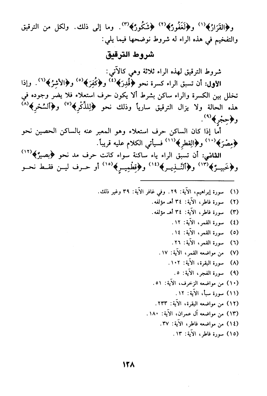 تنبيه: عرفت فيما سبق أن الإمالة سبب من أسباب الترقيق وقد قرأ بها حفص عن عاصم مع من قرأ في كلمة {مجراها} [هود: 14] بهود خاصة دون غيرها من الكلمات ذوات الراء ولهذا رقق الراء فاحفظه.