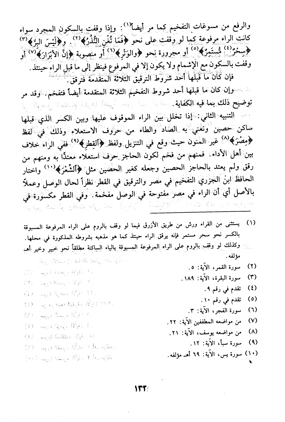 التنبيه الثالث: من الراءات الساكنة للوقف المتحركة في الوصل ما يجوز فيها الوجهان الترقيق والتفخيم والأول هو الأرجح. وهي الراءات المكسورة التي بعدها ياء محذوفة للتخفيف المنحصرة في كلمة {وَنُذُرِ} [القمر: 16و 18 و21 و30 و37 و39] المسبوقة بالواو في ستة مواضع بالقمر وكلمة {يَسْرِ} [الفجر: 4] في قوله تعالى: {والليل إِذَا يَسْرِ} [بالفجر الآية: 4] . فمن رقق نظر إلى الأصل وهو الياء المحذوفة للتخفيف وأجرى الوقف مجرى الوصل.