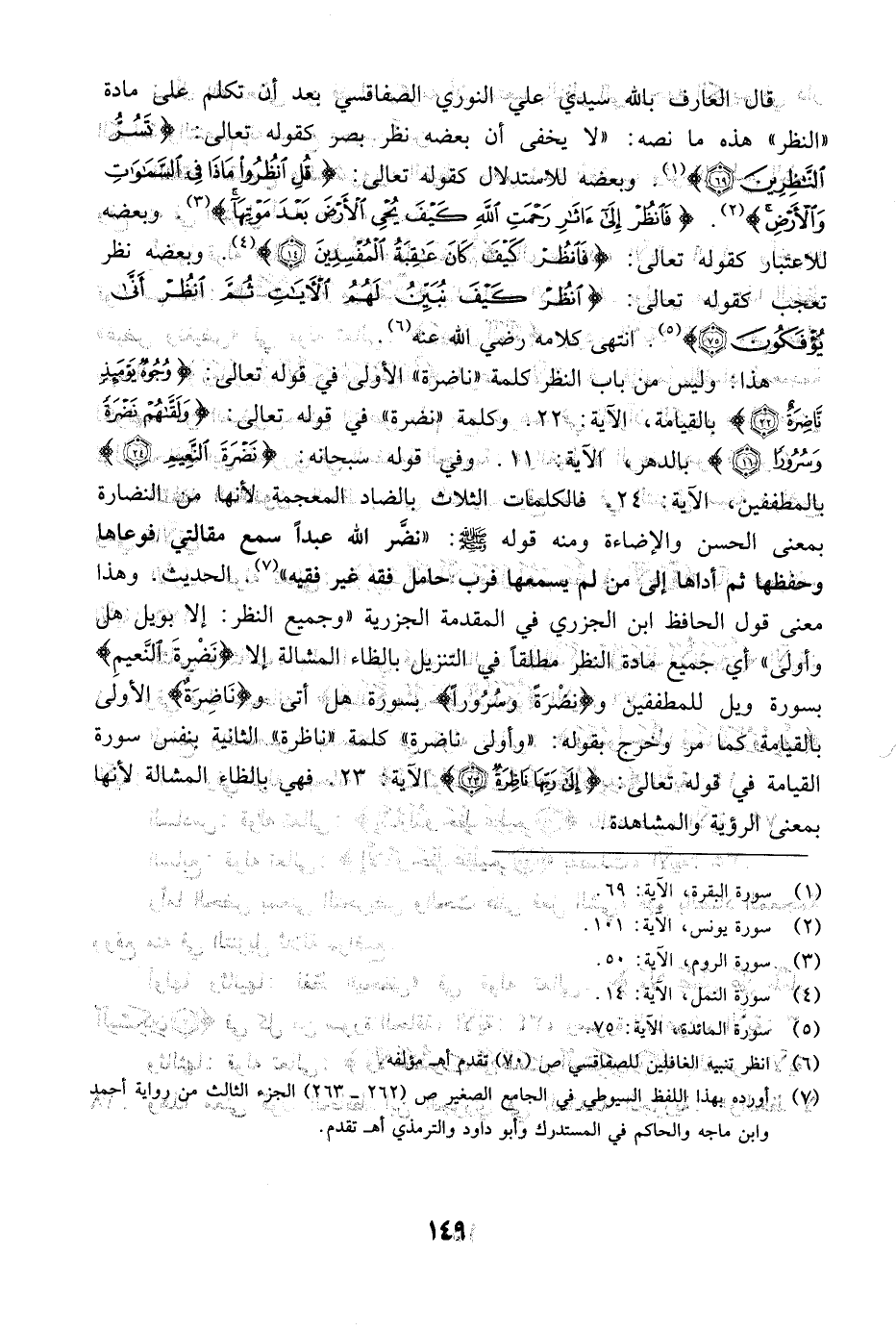 قال العارف بالله سيدي علي النوري الصفاقسي بعد أن تكلم على مادة "النظر" هذه ما نصه: "لا يخفى أن بعضه نظر بصر كقوله تعالى: {تَسُرُّ الناظرين} [البقرة: 69] . وبعضه للاستدلال كقوله تعالى: {قُلِ انظروا مَاذَا فِي السماوات والأرض} [يونس: 101] . {فانظر إلى آثَارِ رَحْمَتِ الله كَيْفَ يُحْيِيِ الأرض بَعْدَ مَوْتِهَآ} [الروم: 50] . وبعضه للاعتبار كقوله تعالى: {فانظر كَيْفَ كَانَ عَاقِبَةُ المفسدين} [النمل: 14] . وبعضه نظر تعجب كقوله تعالى: {انظر كَيْفَ نُبَيِّنُ لَهُمُ الآيات ثُمَّ انظر أنى يُؤْفَكُونَ} [المائدة: 75] . انتهى كلامه رضي الله عنه.
