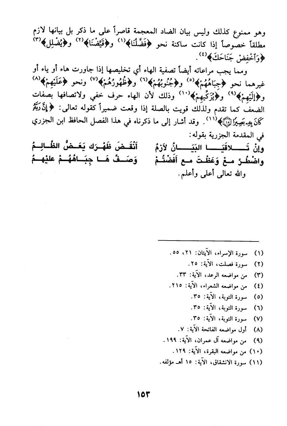 وهو ممنوع كذلك وليس بيان الضاد المعجمة قاصراً على ما ذكر بل بيانها لازم مطلقاً خصوصاً إذا كانت ساكنة نحو {فَضَّلْنَا} [الإسراء: 21، 55] و {وَقَيَّضْنَا} [فصلت: 25] و {يُضْلِلِ} [الرعد: 33] {واخفض جَنَاحَكَ} [الشعراء: 215] .