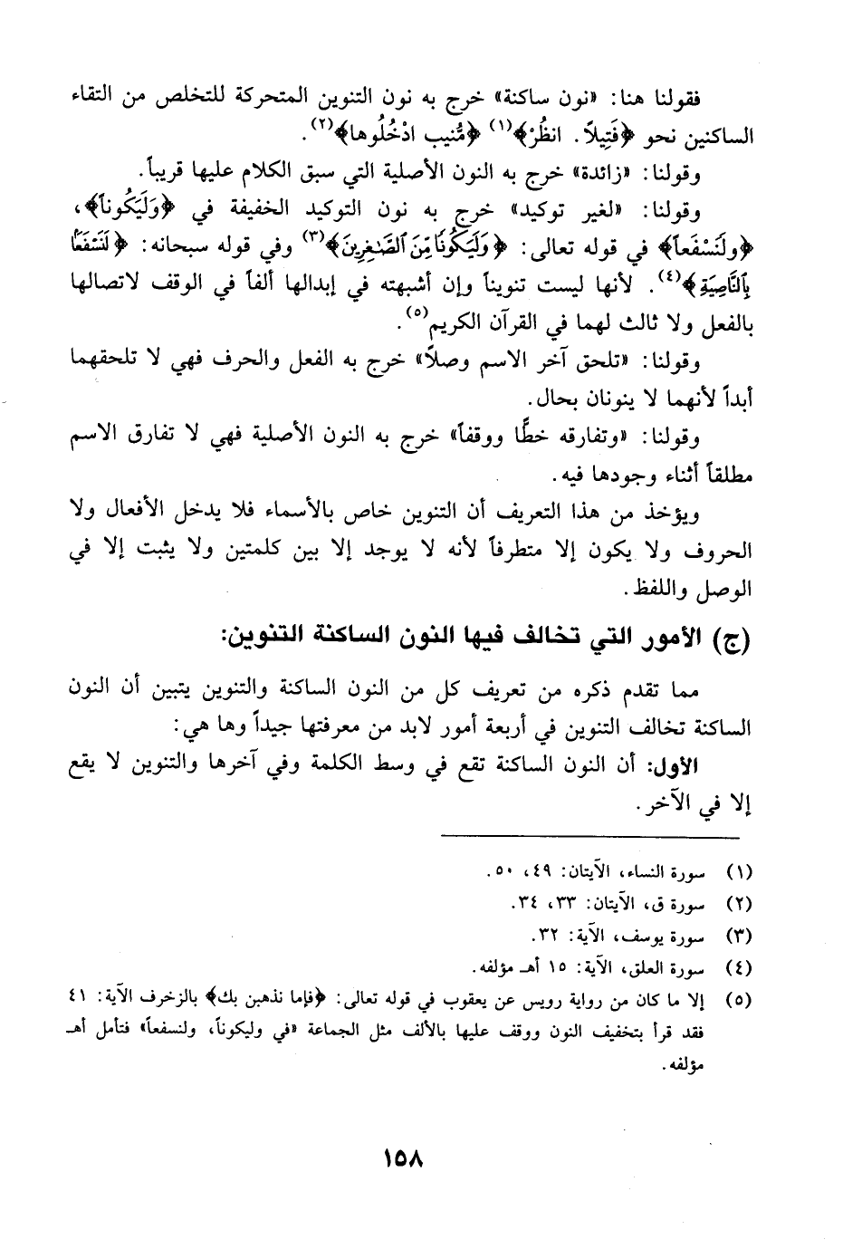 وقولنا: "لغير توكيد" خرج به نون التوكيد الخفيفة في {وَلَيَكُوناً} [يوسف: 32] {لَنَسْفَعاً} [العلق: 15] في قوله تعالى: {وَلَيَكُوناً مِّن الصاغرين} [يوسف: 32] وفي قوله سبحانه: {لَنَسْفَعاً بالناصية} [العلق: 15] . لأنها ليست تنونياً وإن أشبهته في إبدالها ألفاً في الوقف لاتصالها بالفعل ولا ثالث لهما في القرآن الكريم.