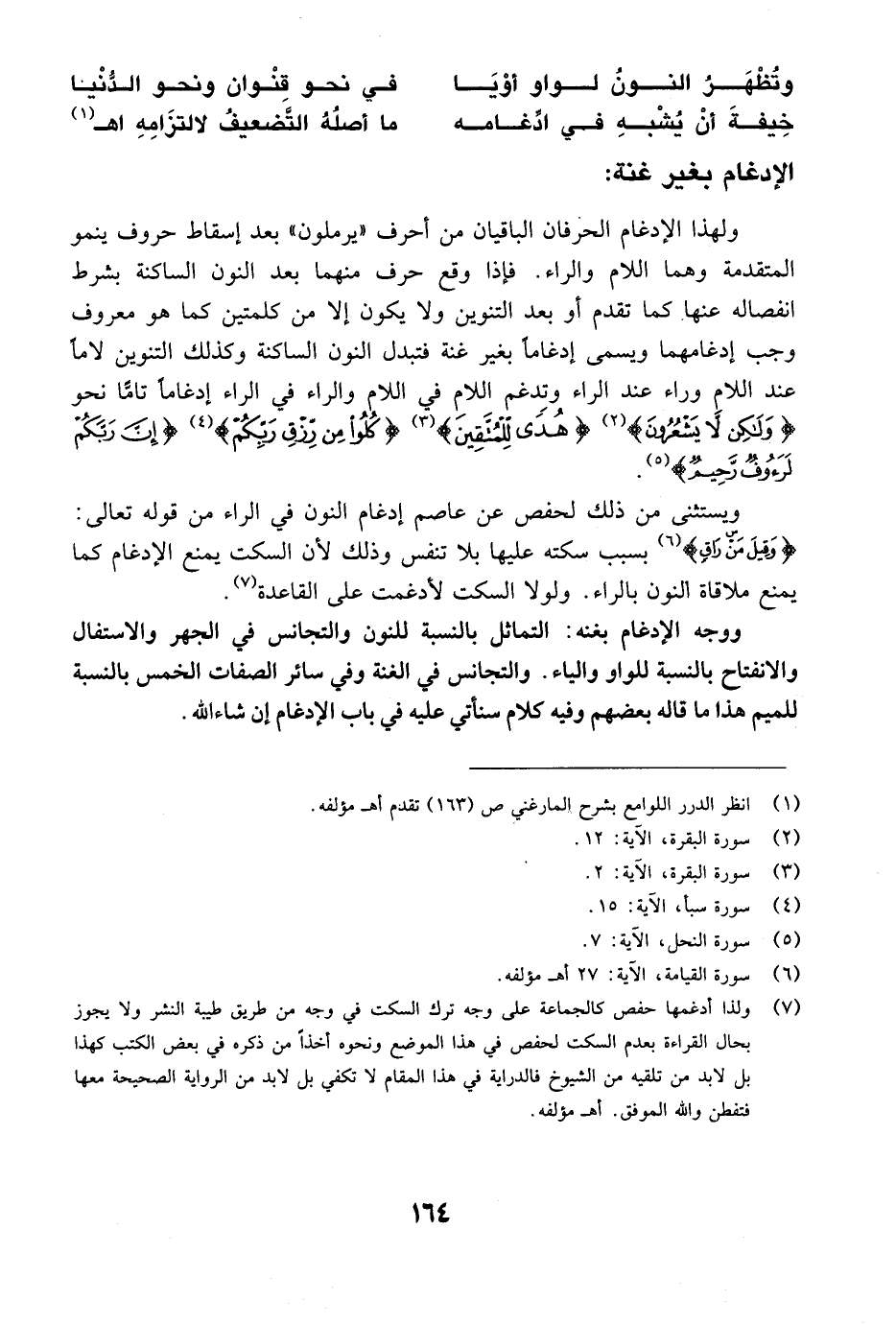 ووجه الإدغام بغنه: التماثل بالنسبة للنون والتجانس في الجهر والاستفال والانفتاح بالنسبة للواو والياء. والتجانس في الغنة وفي سائر الصفات الخمس بالنسبة للميم هذا ما قاله بعضهم وفيه كلام سنأتي عليه في باب الإدغام إن شاء الله.