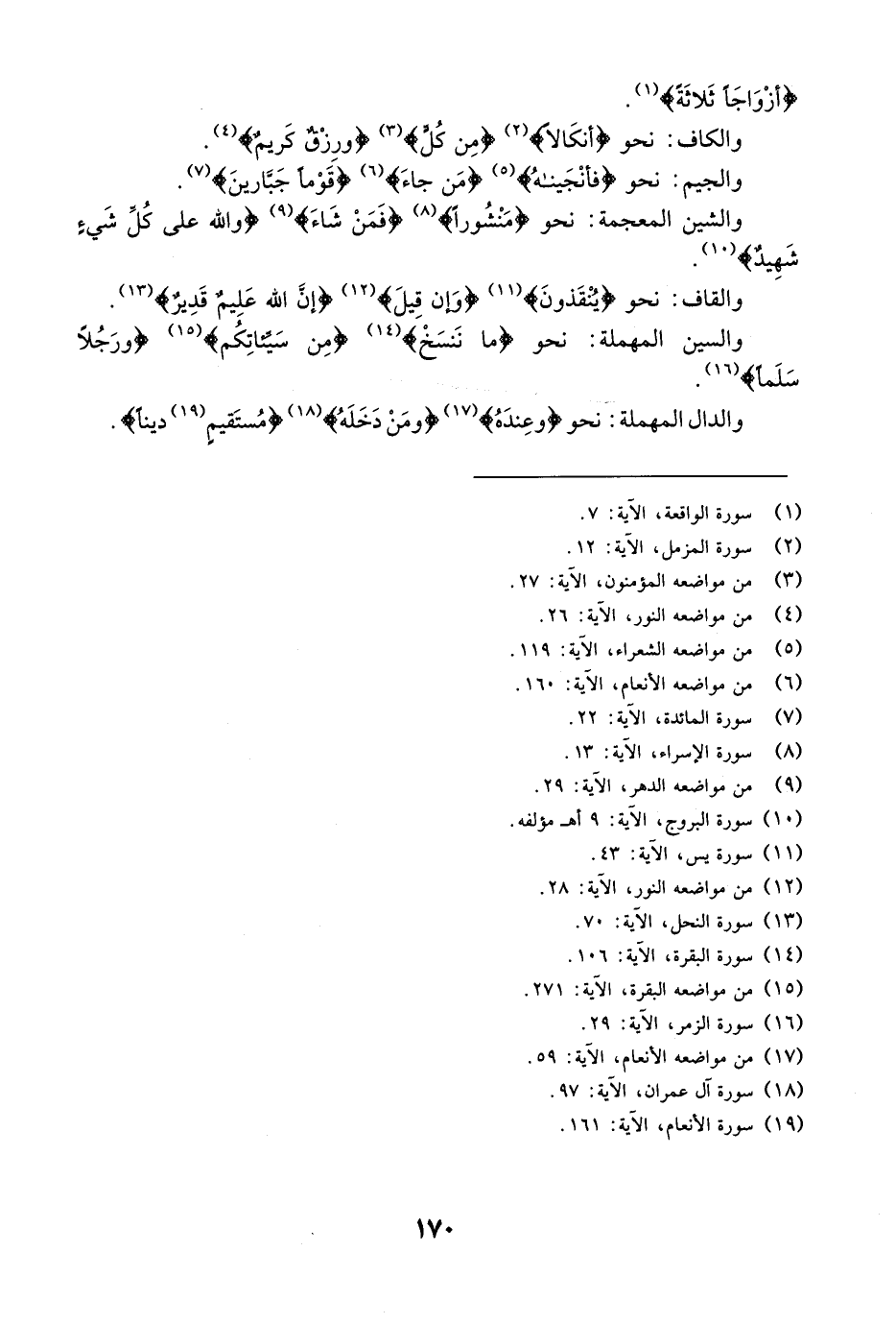 والشين المعجمة: نحو {مَنْشُوراً} [الإسراء: 13] {فَمَن شَآءَ} [الدهر: 29] {والله عَلَى كُلِّ شَيْءٍ شَهِيدٌ} [البروج: 29] .