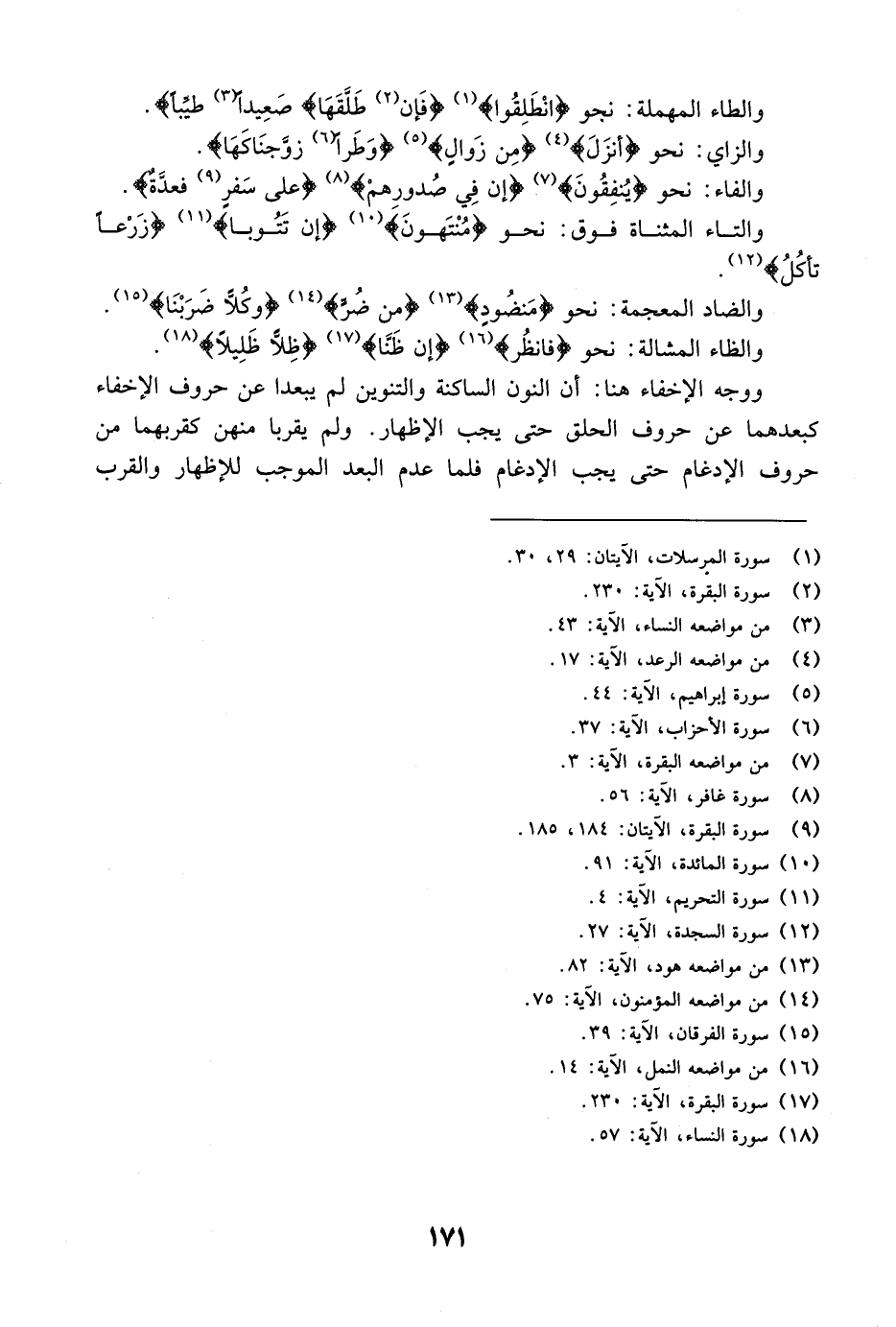 ووجه الإخفاء هنا: أن النون الساكنة والتنوين لم يبعدا عن حروف الإخفاء كبعدهما عن حروف الحلق حتى يجب الإظهار. ولم يقربا منهن كقربهما من حروف الإدغام حتى يجب الإدغام فلما عدم البعد الموجب للإظهار والقرب