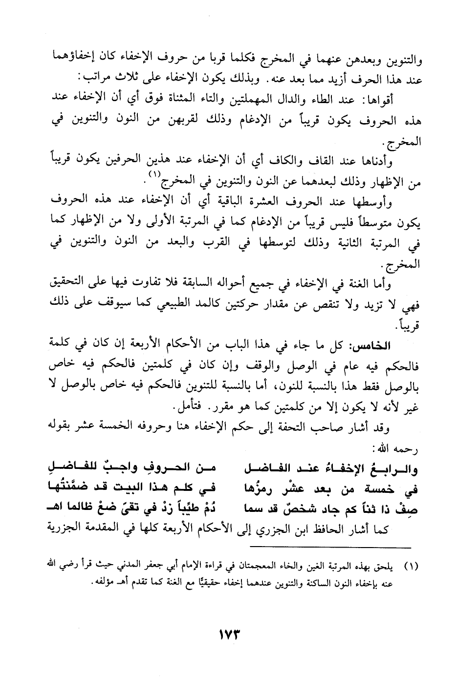 وقد أشار صاحب التحفة إلى حكم الإخفاء هنا وحروفه الخمسة عشر بقوله رحمه الله: