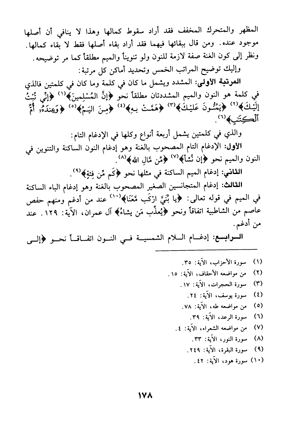 المرتبة الأولى: المشدد ويشمل ما كان في كلمة وما كان في كلمتين فالذي في كلمة هو النون والميم المشددتان مطلقاً نحو {إِنَّ المسلمين} [الأحزاب: 35] {إِنِّي تُبْتُ إِلَيْكَ} [الأحقاف: 15] {يَمُنُّونَ عَلَيْكَ} [الحجرات: 17] {هَمَّتْ بِهِ} [يوسف: 24] {مِّنَ اليم} [طه: 78] {وَعِندَهُ أُمُّ الكتاب} [الرعد: 39] .