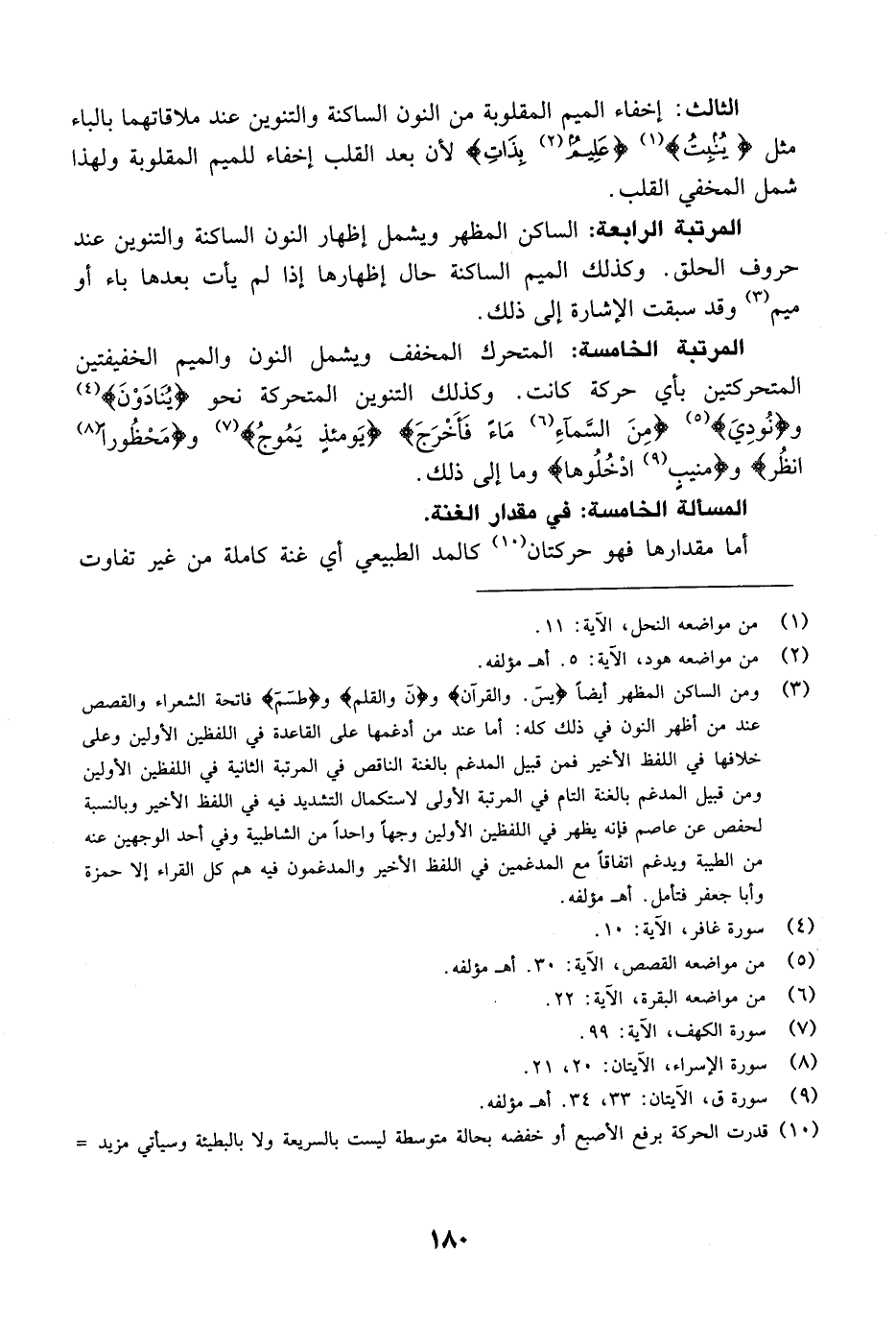 المرتبة الخامسة: المتحرك المخفف ويشمل النون والميم الخفيفتين المتحركتين بأي حركة كانت. وكذلك التنوين المتحركة نحو {يُنَادَوْنَ} [غافر: 10] و {نُودِيَ} [القصص: 30] {مِنَ السمآء مَآءً فَأَخْرَجَ} [البقرة: 22] {يَوْمَئِذٍ يَمُوجُ} [الكهف: 99] {مَحْظُوراً انظر} [الإسراء: 20-21] {مُّنِيبٍ ادخلوها} [ق: 33-34] وما إلى ذلك.