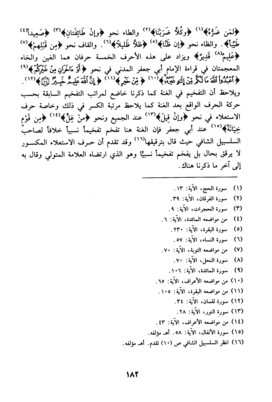 لَمَنْ ضَرُّهُ} [الحج: 13] {وَكُلاًّ ضَرَبْنَا} [الفرقان: 39] . والطاء نحو {وَإِن طَآئِفَتَانِ} [الحجرات: 9] {صَعِيداً طَيِّباً} [المائدة: 6] . والظاء نحو {إِن ظَنَّآ} [البقرة: 230] {ظِلاًّ ظَلِيلاً} [النساء: 57] . والقاف نحو {مِن قَبْلِهِمْ} [التوبة: 70] {عَلِيمٌ قَدِيرٌ} [النحل: 70] ويزاد على هذه الأحرف الخمسة حرفان هما الغين والخاء المعجمتان في قراءة الإمام أبي جعفر المدني في نحو {أَوْ آخَرَانِ مِنْ غَيْرِكُمْ} [المائدة: 106] {اعبدوا الله مَا لَكُمْ مِّنْ إلاه غَيْرُهُ} [الأعراف: 65] {مِّنْ خَيْرٍ} [البقرة: 105] {إِنَّ الله عَلَيمٌ خَبِيرٌ} [لقمان: 34] . ويلاحظ أن التفخيم في الغنة كما ذكرنا خاضع لمراتب التفخيم السابقة بحسب حركة الحرف الواقع بعد الغنة كما يلاحظ مرتبة الكسر في ذلك وخاصة حرف الاستعلاء في نحو {وَإِن قِيلَ} [النور: 28] عند الجميع ونحو {مِّنْ غِلٍّ} [الأعراف: 43] {مِن قَوْمٍ خِيَانَةً} [الأنفال: 58] عند أبي جعفر فإن الغنة هنا تفخم تفخيماً نسبياً خلافاً لصاحب السلسبيل الشافي حيث قال بترقيقها وقد تقدم أن حرف الاستعلاء المكسور لا يرقق بحال بل يفخم تفخيماً نسبيّاً وهو الذي ارتضاه العلامة المتولي وقال به إلى آخر ما ذكرنا هناك.