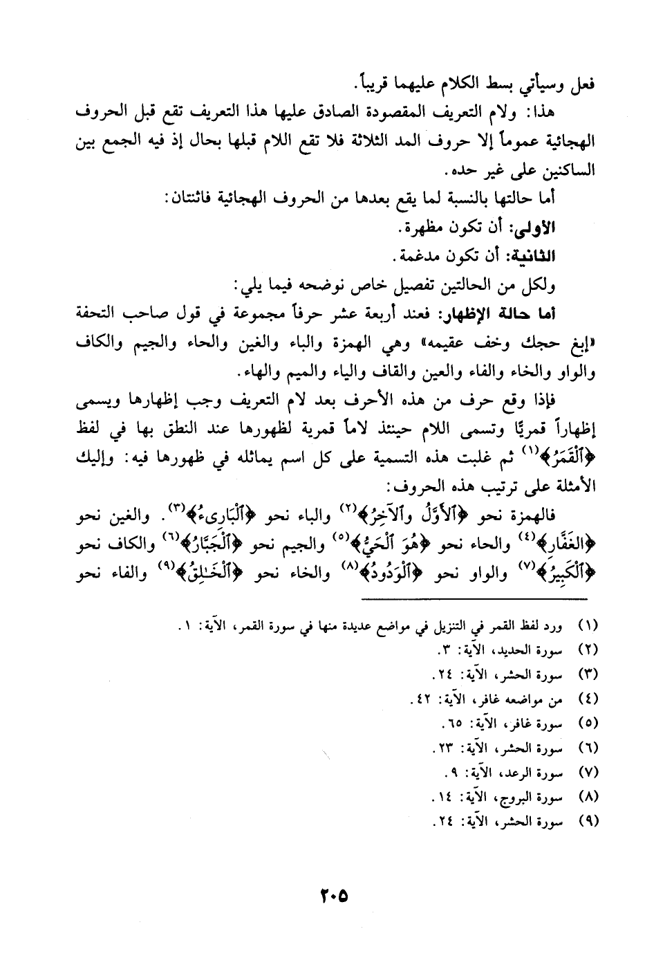 فإذا وقع حرف من هذه الأحرف بعد لام التعريف وجب إظهارها ويسمى إظهاراً قمريّاً وتسمى اللام حينئذ لاماً قمرية لظهورها عند النطق بها في لفظ {القمر} [القمر: 1] ثم غلبت هذه التسمية على كل اسم يماثله في ظهورها فيه: وإليك الأمثلة على ترتيب هذه الحروف: