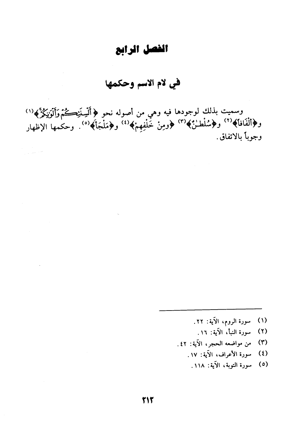 وسميت بذلك لوجودها فيه وهي من أصوله نحو {أَلْسِنَتِكُمْ وَأَلْوَانِكُمْ} [الروم: 22] و {أَلْفَافاً} [النبأ: 16] و {سُلْطَانٌ} [الحجر: 42] {وَمِنْ خَلْفِهِمْ} [الأعراف: 17] و {مَلْجَأَ} [التوبة: 118] . وحكمها الإظهار وجوباً بالاتفاق.