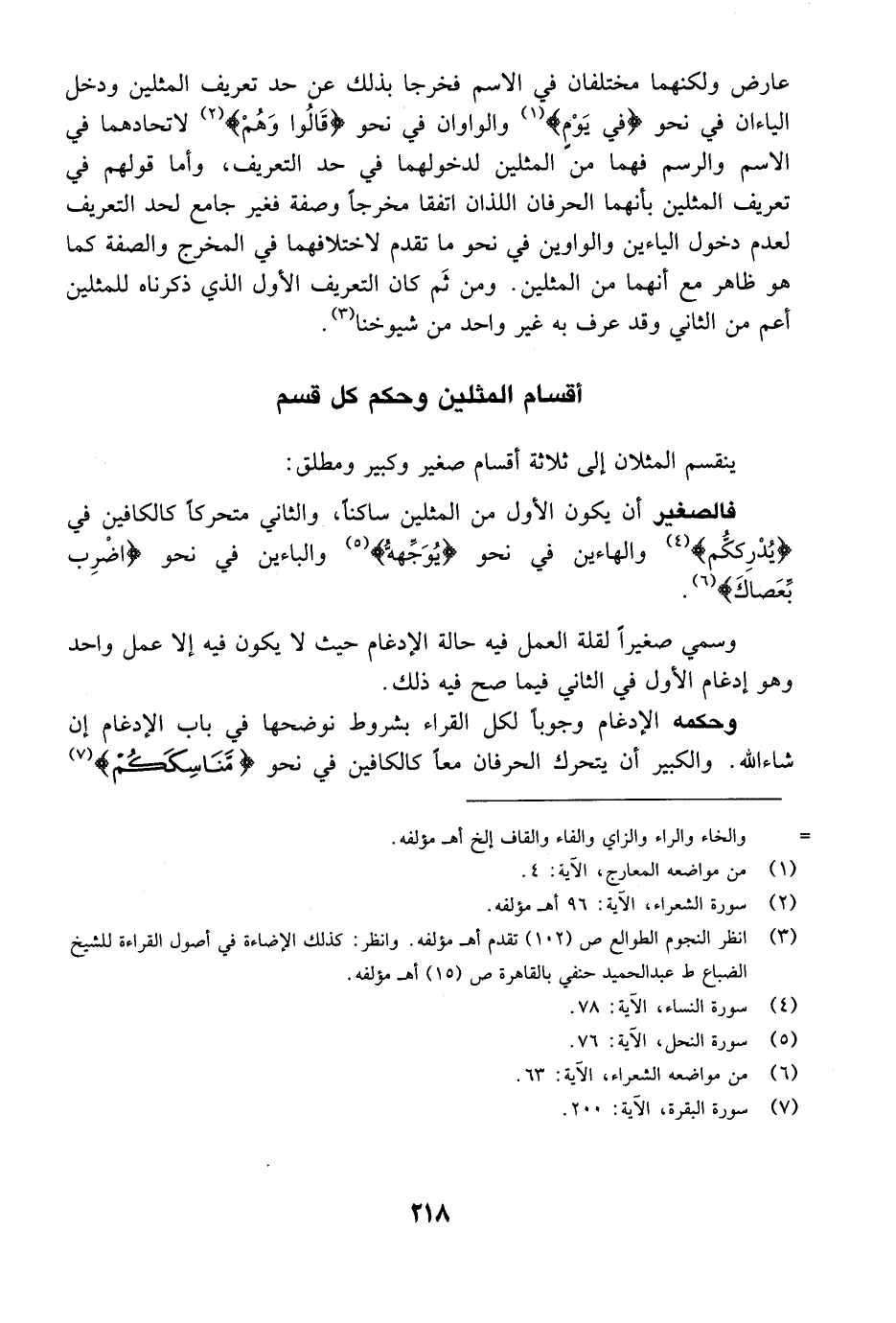 عارض ولكنهما مختلفان في الاسم فخرجا بذلك عن حد تعريف المثلين ودخل الياءان في نحو {فِي يَوْم} [المعارج: 4] والواوان في نحو {قَالُواْ وَهُمْ} [الشعراء: 96] لاتحادهما في الاسم والرسم فهما من المثلين لدخولهما في حد التعريف، وأما قولهم في تعريف المثلين بأنهما الحرفان اللذان اتفقا مخرجاً وصفة فغير جامع لحد التعريف لعدم دخول الياءين والواوين في نحو ما تقدم لاختلافهما في المخرج والصفة كما هو ظاهر مع أنهما من المثلين. ومن ثَم كان التعريف الأول الذي ذكرناه للمثلين أعم من الثاني وقد عرف به غير واحد من شيوخنا.