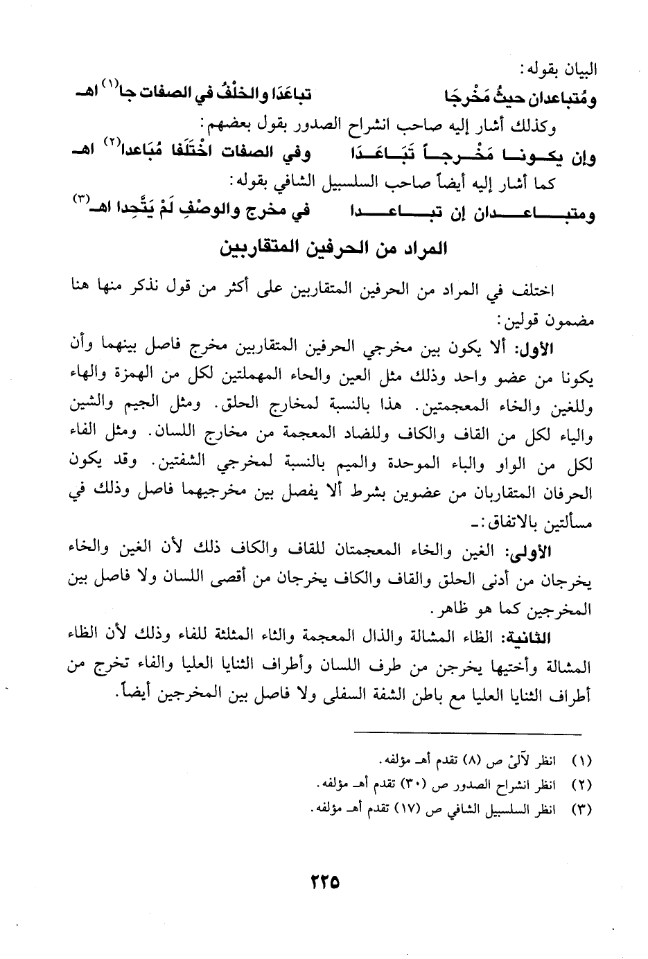 الأول: ألا يكون بين مخرجي الحرفين المتقاربين مخرج فاصل بينهما وأن يكونا من عضو واحد وذلك مثل العين والحاء المهملتين لكل من الهمزة والهاء وللغين والخاء المعجمتين. هذا بالنسبة لمخارج الحلق. ومثل الجيم والشين والياء لكل من القاف والكاف وللضاد المعجمة من مخارج اللسان. ومثل الفاء لكل من الواو والباء الموحدة والميم بالنسبة لمخرجي الشفتين. وقد يكون الحرفان المتقاربان من عضوين بشرط ألا يفصل بين مخرجيهما فاصل وذلك في مسألتين بالاتفاق: -