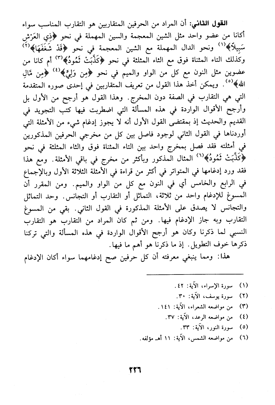 القول الثاني: أن المراد من الحرفين المتقاربين هو التقارب المناسب سواء أكانا من عضو واحد مثل الشين المعجمة والسين المهملة في نحو {ذِي العرش سَبِيلاً} [الإسراء: 42] ونحو الدال المهملة مع الشين المعجمة في نحو {قَدْ شَغَفَهَا} [يوسف: 30] وكذلك التاء المثناة فوق مع الثاء المثلثة في نحو {كَذَّبَتْ ثَمُودُ} [الشعراء: 141] أم كانا من عضوين مثل النون مع كل من الواو والميم في نحو {مِن وَلِيٍّ} [الرعد: 37] {مِّن مَّالِ الله} [النور: 33] . ويمكن أخذ هذا القول من تعريف المتقاربين في إحدى صوره المتقدمة التي هي التقارب في الصفة دون المخرج. وهذا القول هو أرجح من الأول بل وأرجح الأقوال الواردة في هذه المسألة التي اضطربت فيها كتب التجويد في القديم والحديث إذ بمقتضى القول الأول أنه لا يجوز إدغام شيء من الأمثلة التي أوردناها في القول الثاني لوجود فاصل بين كل من مخرجي الحرفين المذكورين في أمثلته فقد فصل بمخرج واحد بين التاء المثناة فوق والثاء المثلثة في نحو {كَذَّبَتْ ثَمُودُ} [الشمس: 11] المثال المذكور وبأكثر من مخرج في باقي الأمثلة. ومع هذا فقد ورد أدغامها في المتواتر في أكثر من قراءة في الأمثلة الثلاثة الأولى وبالإجماع في الرابع والخامس اي في النون مع كل من الواو والميم. ومن المقرر أن المسوغ للإدغام واحد من ثلاثة، التماثل أو التقارب أو التجانس. وحد التماثل والتجانس لا يصدق على الأمثلة المذكورة في القول الثاني. بقي من المسوغ التقارب وبه جاز الإدغام فيها. ومن ثم كان المراد من التقارب هو التقارب النسبي لما ذكرنا وكان هو أرجح الأقوال الواردة في هذه المسألة والتي تركنا ذكرها خوف التطويل. إذ ما ذكرنا هو أهم ما فيها.