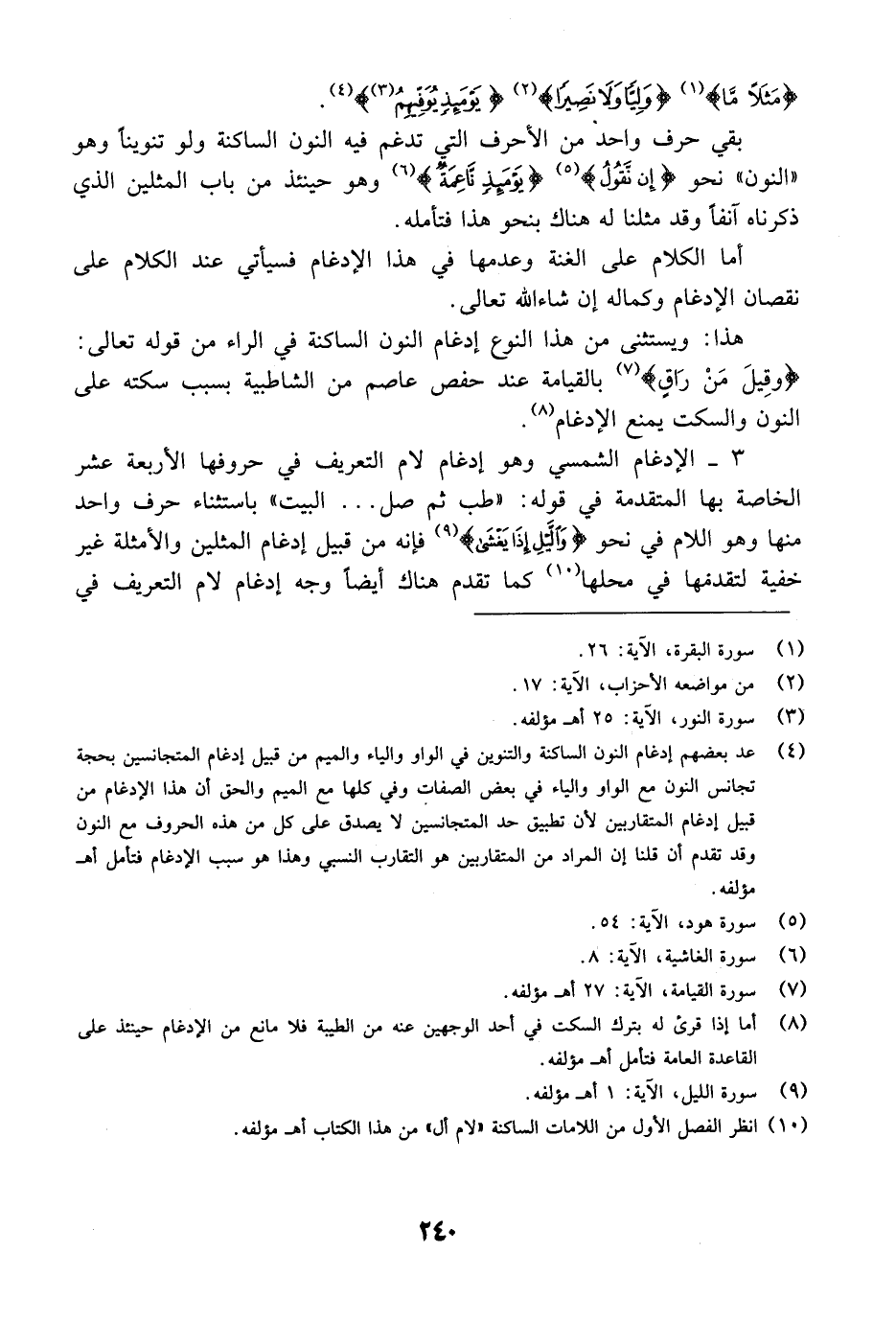 3- الإدغام الشمسي وهو إدغام لام التعريف في حروفها الأربعة عشر الخاصة بها المتقدمة في قوله: "طب ثم صل ... البيت" باستثناء حرف واحد منها وهو اللام في نحو {والليل إِذَا يغشى} [الليل: 1] فإنه من قبيل إدغام المثلين والأمثلة غير خفية لتقدمها في محلها كما تقدم هناك أيضاً وجه إدغام لام التعريف في